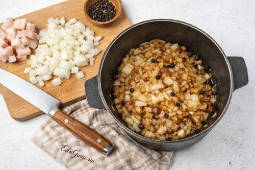 Важно не пересушить сало, так что его не вынимайте из казана. Добавьте к салу нарезанный полукольцами лук и несколько горошин перца, продолжайте жарить все вместе около пяти минут, пока лук не станет золотистым.