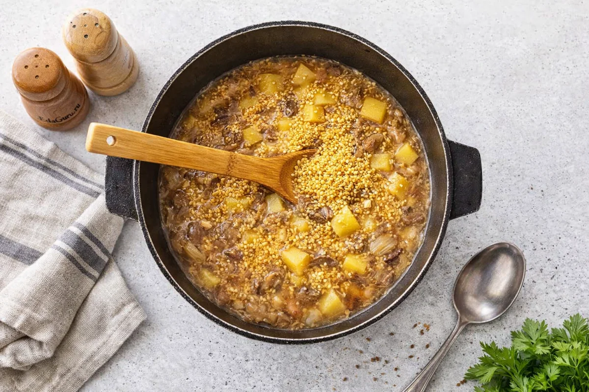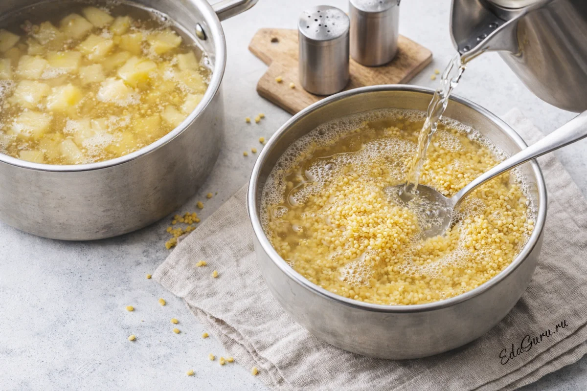 Пока картошка в бульоне закипает и варится, положите пшено в миску и залейте его кипятком. Перемешайте и оставьте на пару минут, затем слейте воду. Повторите процедуру еще раз, это поможет убрать горечь из пшена.