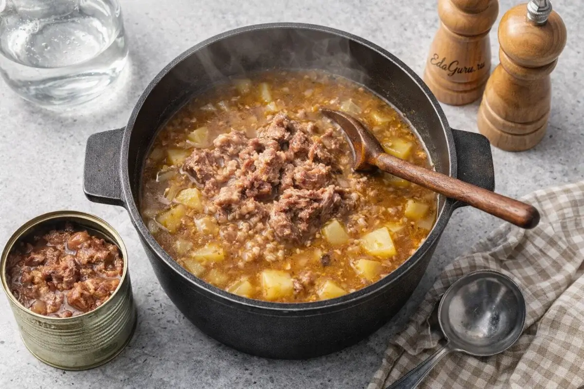 Как только картофель и крупа станут почти мягкими, добавьте тушенку в казан. Если кажется, что кулеш получился слишком густым, влейте немного кипящей воды. Хорошо перемешайте и оставьте вариться еще пять минут.