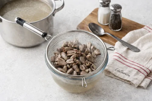 Куриные сердечки отварите до готовности — обычно на это уходит 35–40 минут. Затем переложите в дуршлаг, чтобы стекла лишняя жидкость. Бульон после варки сердечек получается мутным, поэтому для рассольника его лучше не брать.