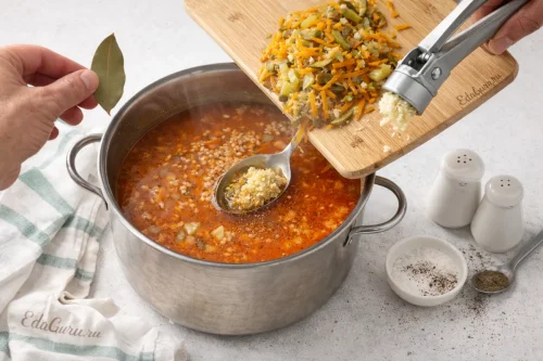 Выньте лавровый лист. Затем переложите в кастрюлю тушеные овощи и сразу выдавите туда чеснок. Попробуйте суп на вкус, после чего добавьте перец и соль по вкусу.