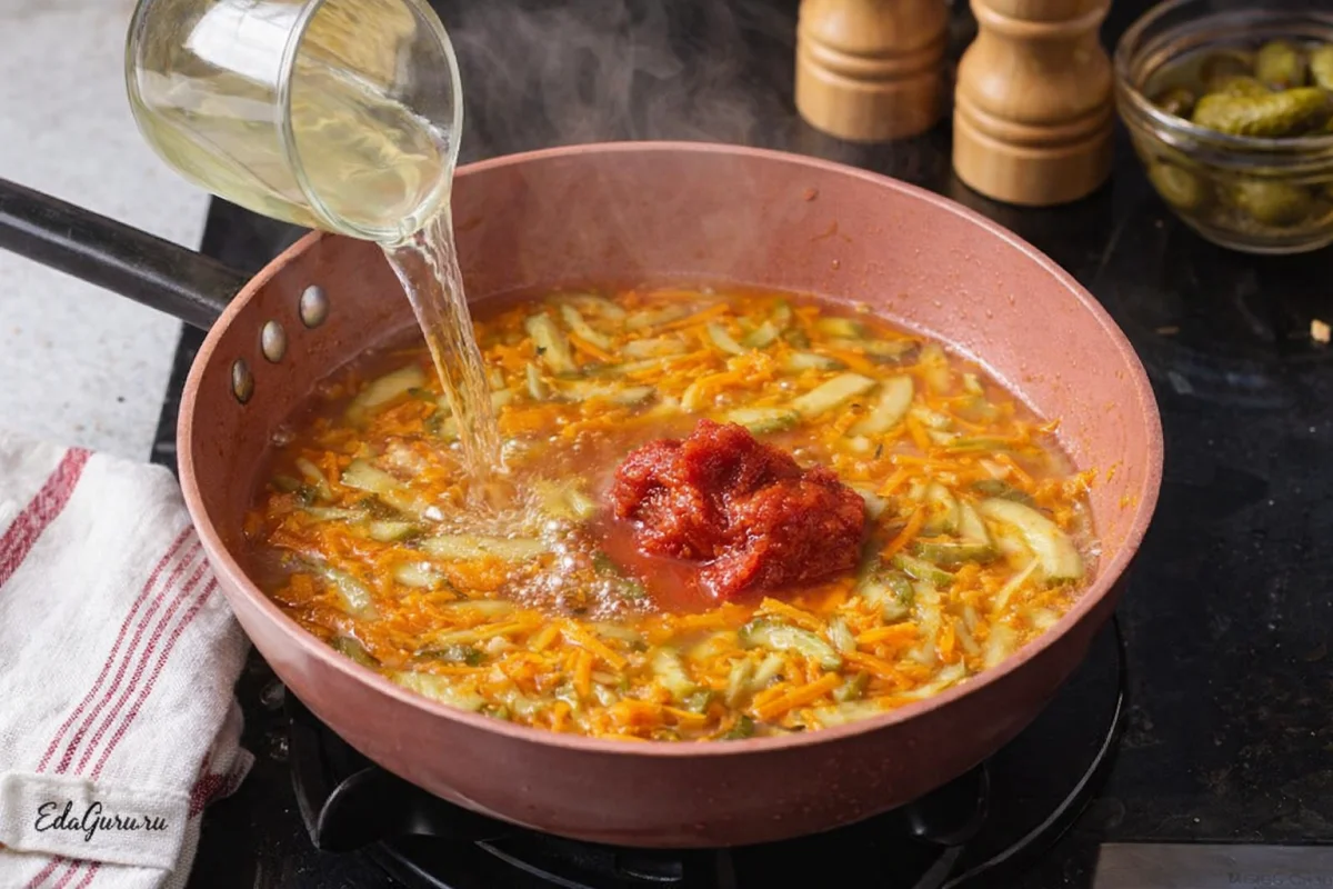 Влейте в сковороду немного чистой воды, при желании добавьте немного огуречного рассола. Затем положите томатную пасту и тушите овощи на слабом огне семь минут. Следите, чтобы жидкость не выкипела слишком быстро.