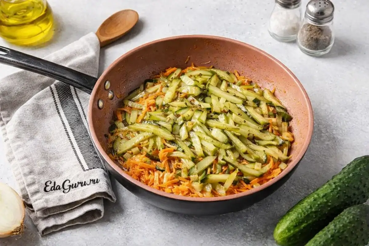 Морковь натрите на терке, а огурцы и лук нарежьте. Разогрейте масло в сковороде, выложите морковь с луком и обжаривайте три минуты. Затем добавьте огурцы и готовьте еще три минуты. Следите, чтобы овощи не подгорели.