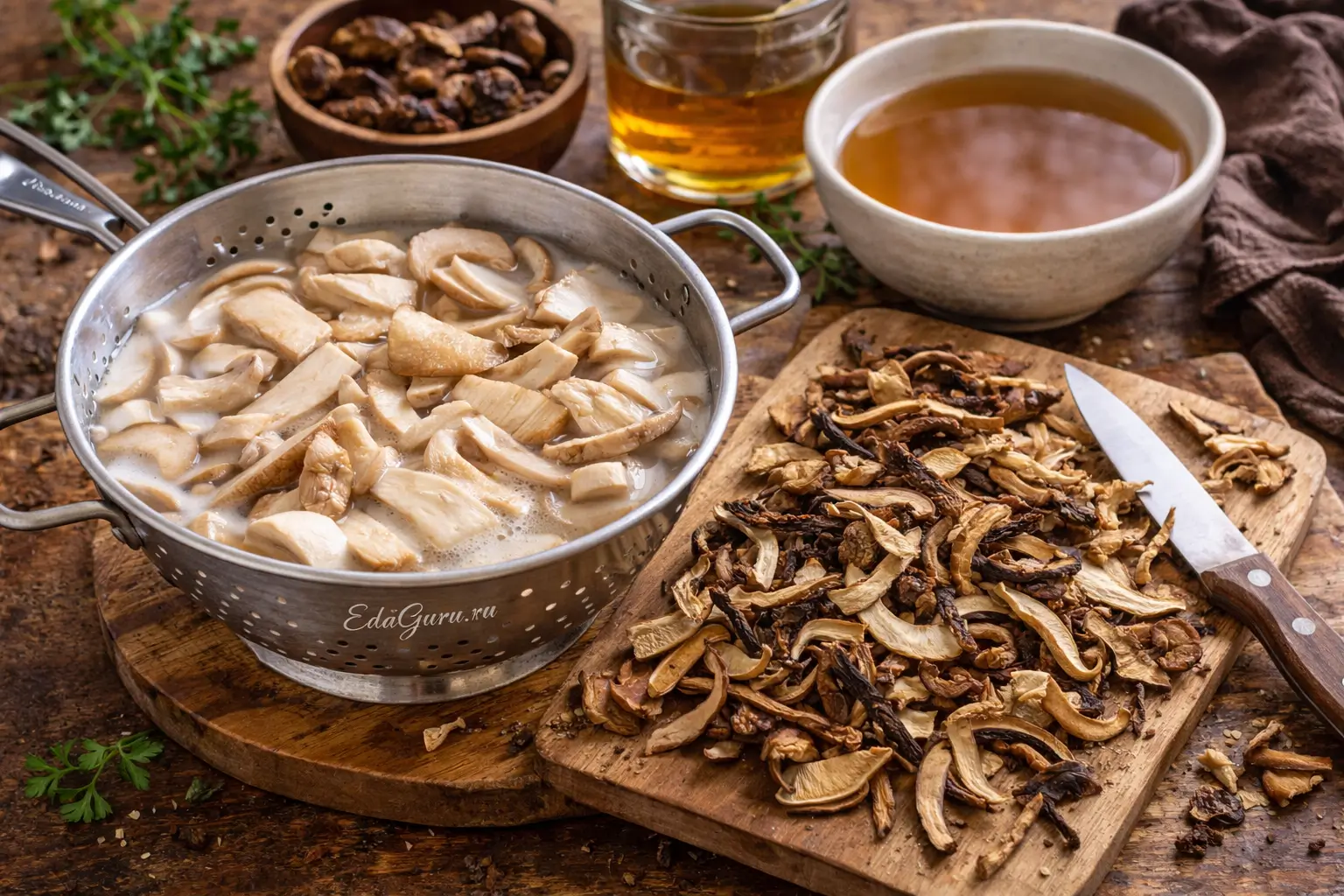 Грузди замочите в воде или молоке на 1 сутки. Затем хорошо их промойте и нарежьте тонкими ломтиками. В сушеные грибы налейте 2 л теплой воды и оставьте на два часа, после чего обсушите и также нарежьте. Грибной настой обязательно процедите и сохраните — он пригодится дальше.