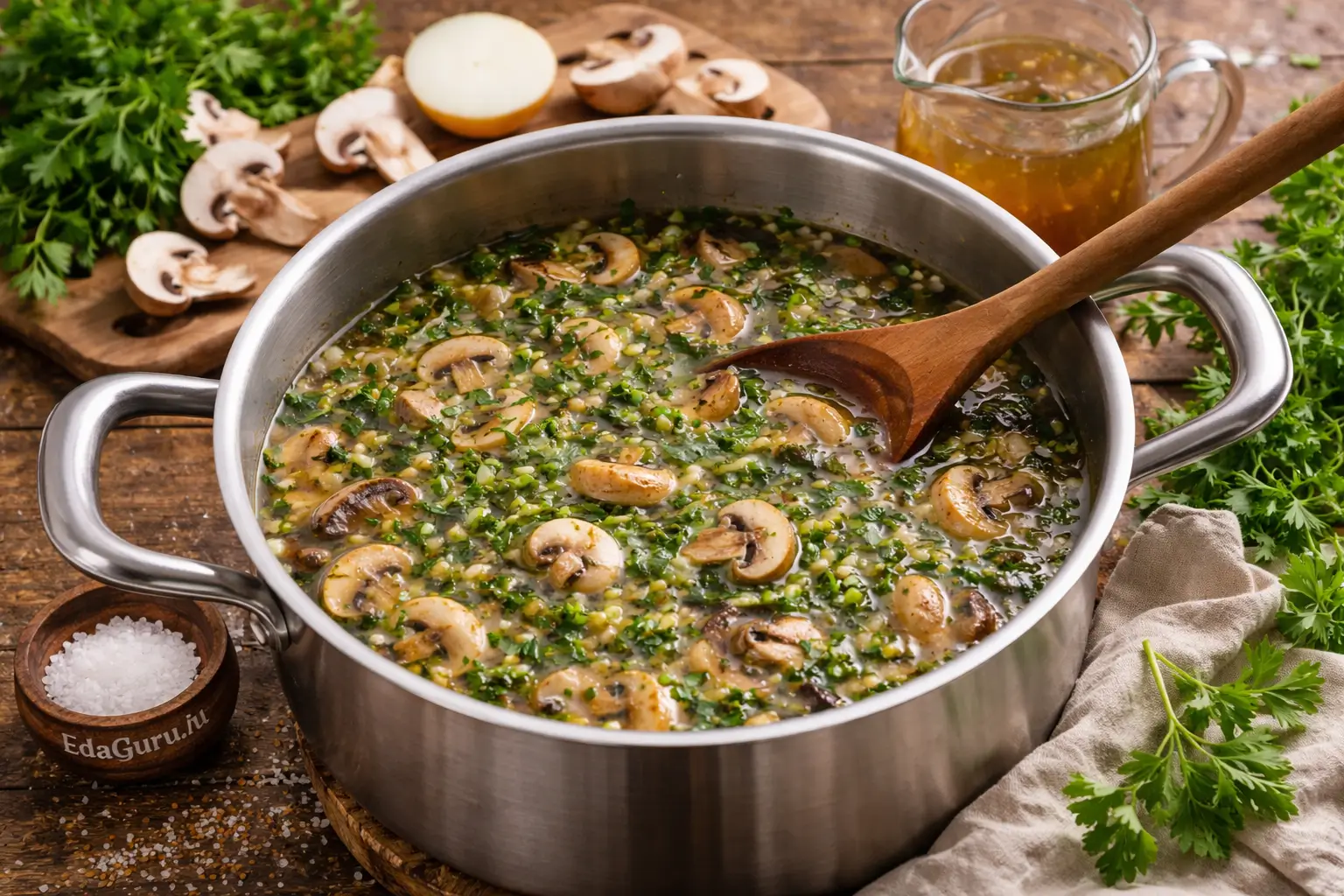 В глубокой кастрюле разогрейте масло и 5-8 минут обжаривайте грибы, петрушку и лук. Затем влейте оставшийся грибной настой, дайте закипеть бульону и проварите ещё десять минут. Не жарьте на слишком сильном огне, чтобы зелень и лук не начали горчить.