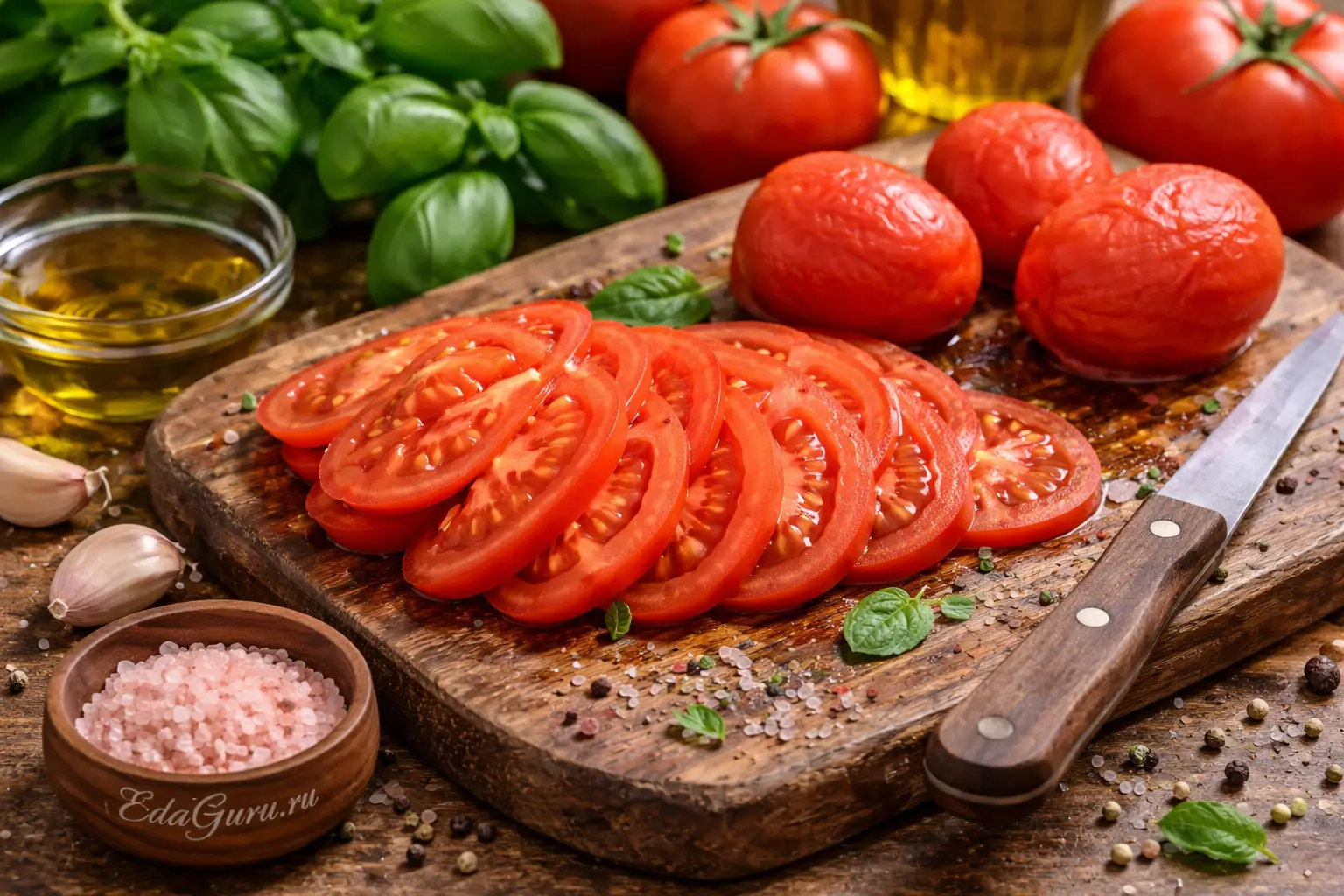 Помидоры ошпарьте кипятком, затем снимите с них кожицу. Нарежьте мякоть тонкими дольками и отправьте в солянку вместе с огурцами и бульоном, где они варились. Чтобы кожура снималась легче, после кипятка можно сразу слегка остудить помидоры.