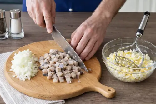 Нарежьте маленькими кусочками филе сельди, косточки убирайте. Измельчите лук. Яйца разомните их вилкой, чтобы масса получилась более ровной, разминайте яйца без крупных комков.