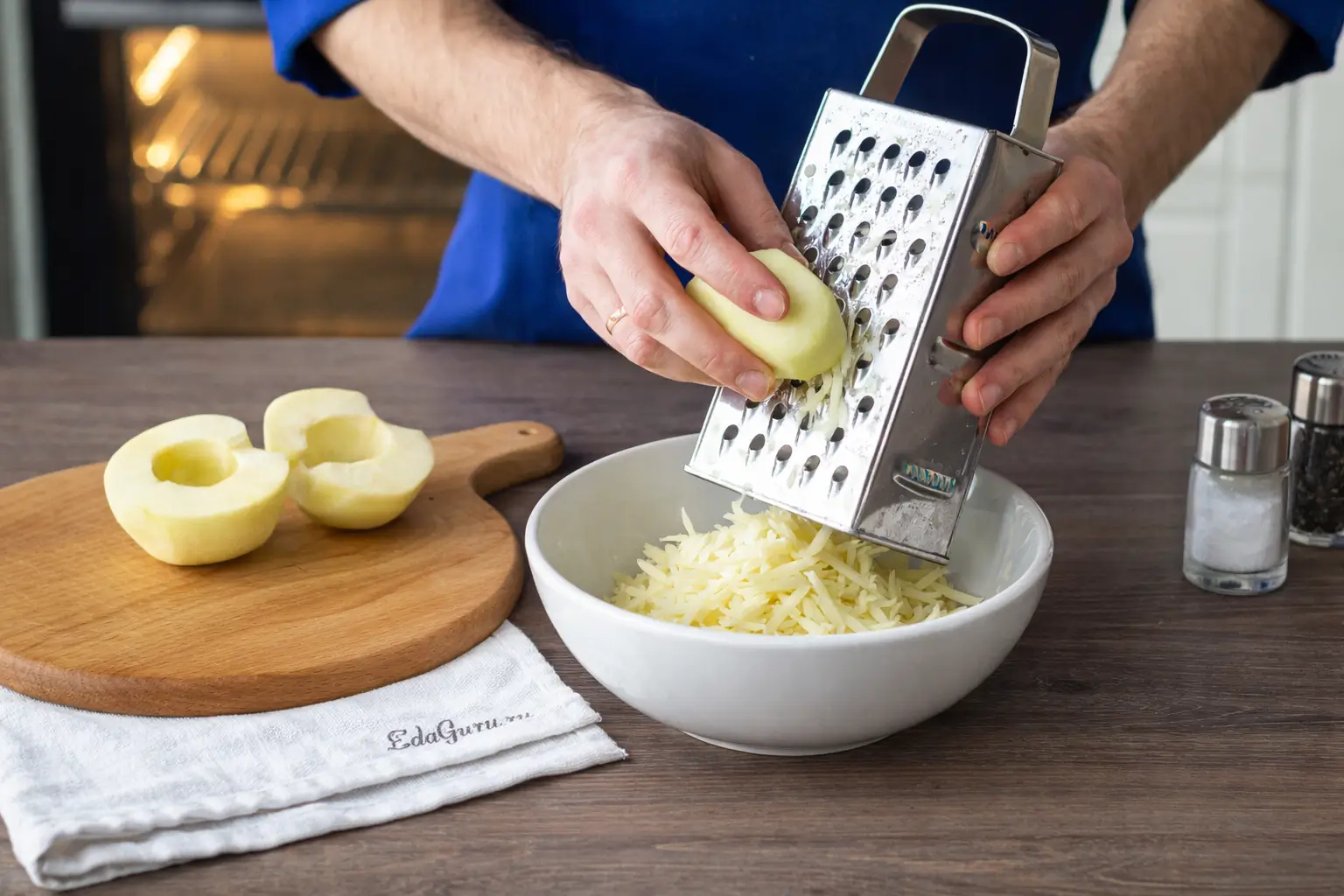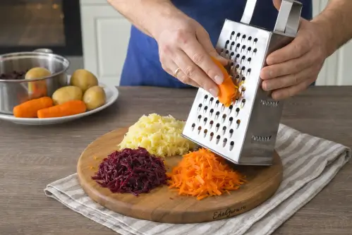 Отварите до полной готовности морковь и картофель. Затем дайте всем овощам остыть и на крупной терке по отдельности натрите их Чтобы овощи не стали водянистыми, не измельчайте их горячими.