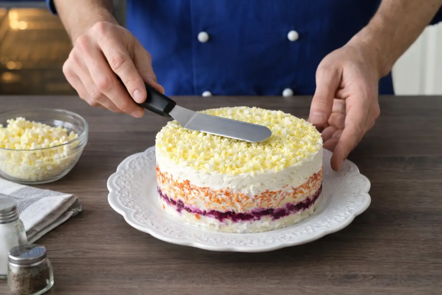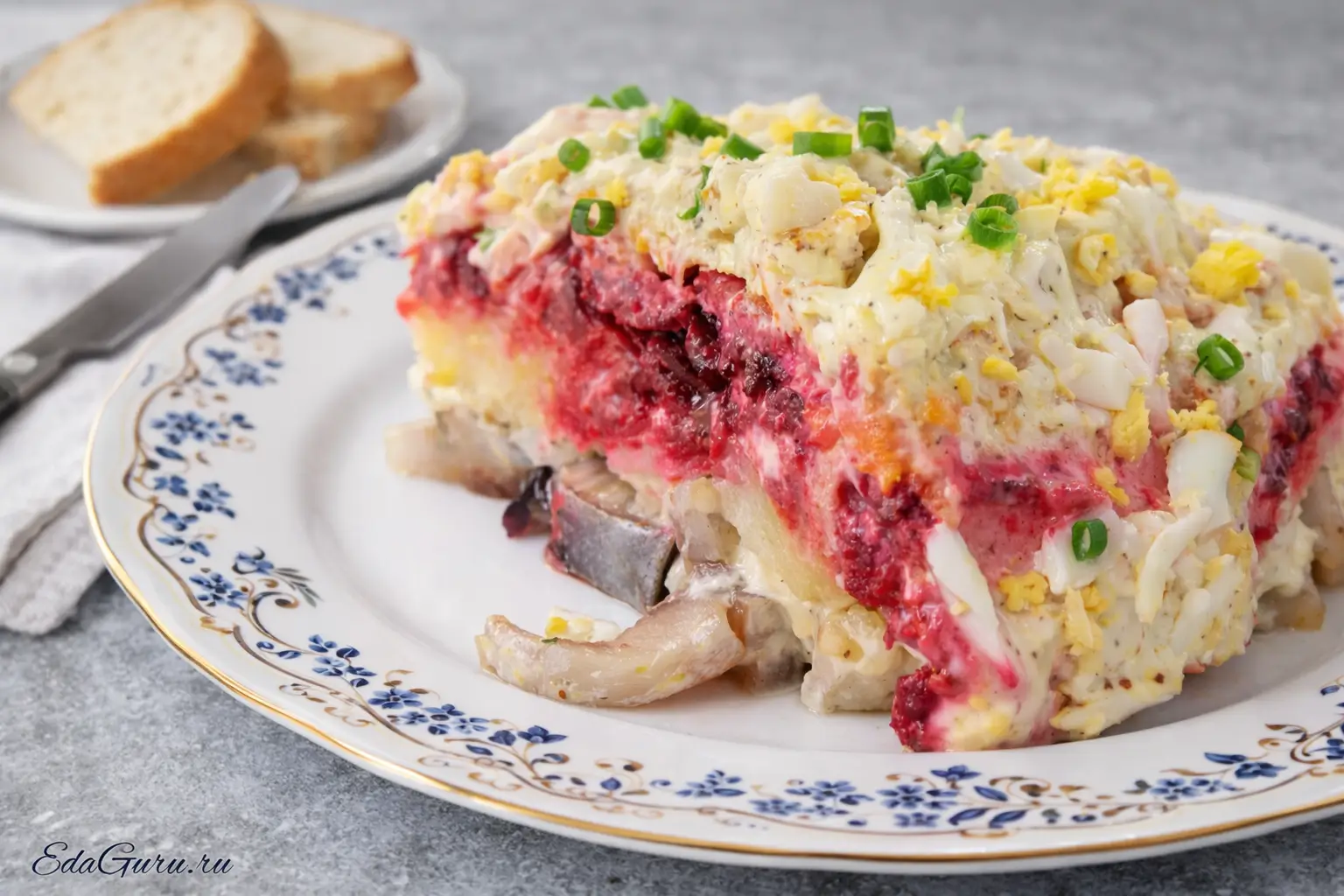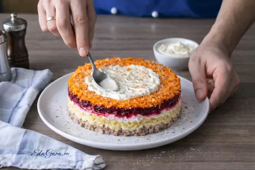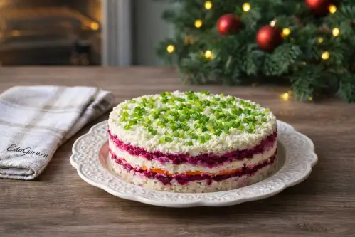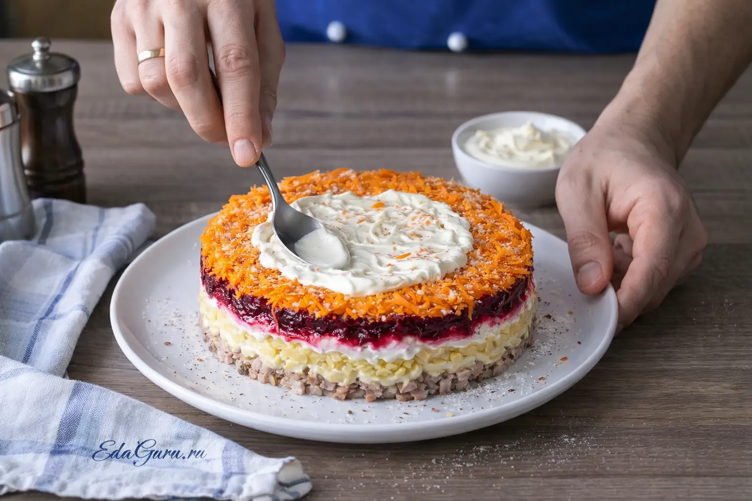 «Селедка под шубой» — один из самых узнаваемых салатов новогоднего стола в России и странах бывшего СССР. Блюдо готовят слоями: соленая сельдь, отварные овощи, чаще всего картофель, морковь и свекла, а также лук и майонез. Именно свекла придает салату характерный рубиновый верхний слой. Массовую популярность рецепт получил в советское время, когда простые и доступные продукты стали основой домашнего праздничного меню. Салат особенно прочно связан с Новым годом: его часто готовят заранее, чтобы он успел пропитаться и стал нежнее по вкусу. Несмотря на множество домашних вариантов, суть рецепта остается неизменной — сочетание соленой рыбы, сладковатой свеклы и мягкой текстуры овощных слоев.