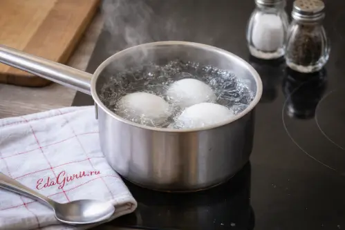 Сложите яйца в сотейник, залейте водой и поставьте на огонь. Когда вода закипит, варите 7-8 минут, затем слейте ее и оставьте яйца остывать. Чтобы скорлупа потом легче снималась, не передерживайте яйца в горячей воде.