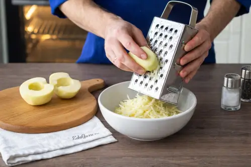 Яблоко хорошо помойте, разрежьте пополам и удалите сердцевину. Затем снимите кожуру с мякоти и на крупной терке натрите яблоко.