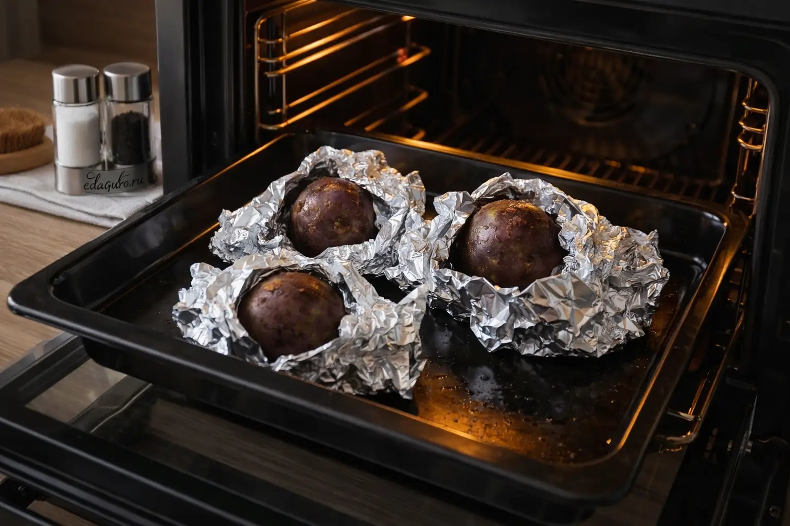 Разогрейте духовку до 180 °C. Свеклу для «селедки под шубой» хорошо помойте, затем каждую заверните в фольгу. Переложите на противень и запекайте примерно один час. Если корнеплоды крупные, времени может понадобиться немного больше.