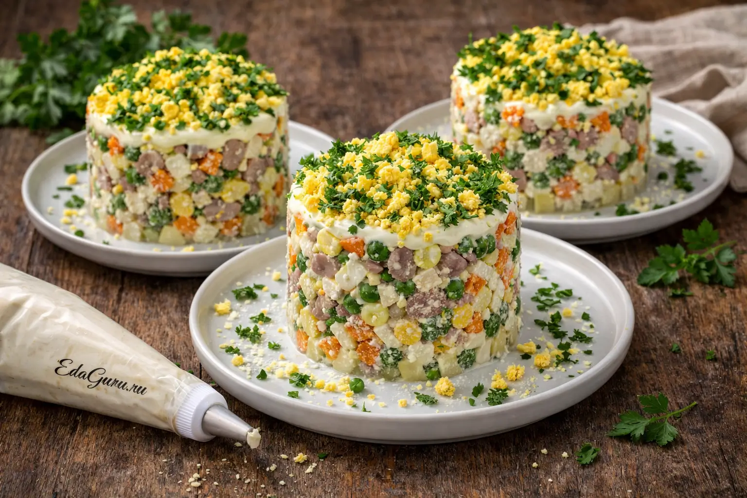 Каждый слой слегка промазывайте майонезом; для удобства можно наносить его с помощью кулинарного мешка. Сверху украсьте порции салата сначала измельченной зеленью, затем яичными желтками, после чего уберите в холодильник минимум на 25 минут. Подавайте салат хорошо охлажденным. Главное — не добавляйте слишком много майонеза, чтобы слои сохранили форму.