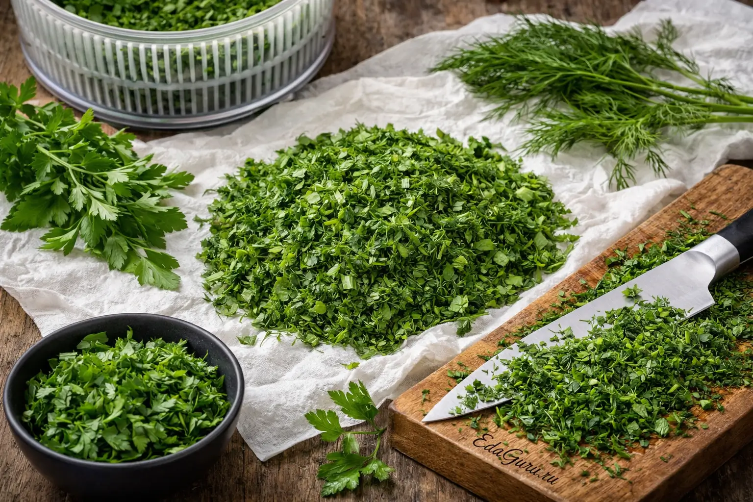 Зелень сначала хорошо промойте под проточной водой, затем особенно тщательно обсушите. Это важно: если оставить лишнюю влагу, салат может получиться водянистым. Несколько веточек оставьте для украшения готовой «Мимозы» со шпротами, а всю остальную зелень измельчите.