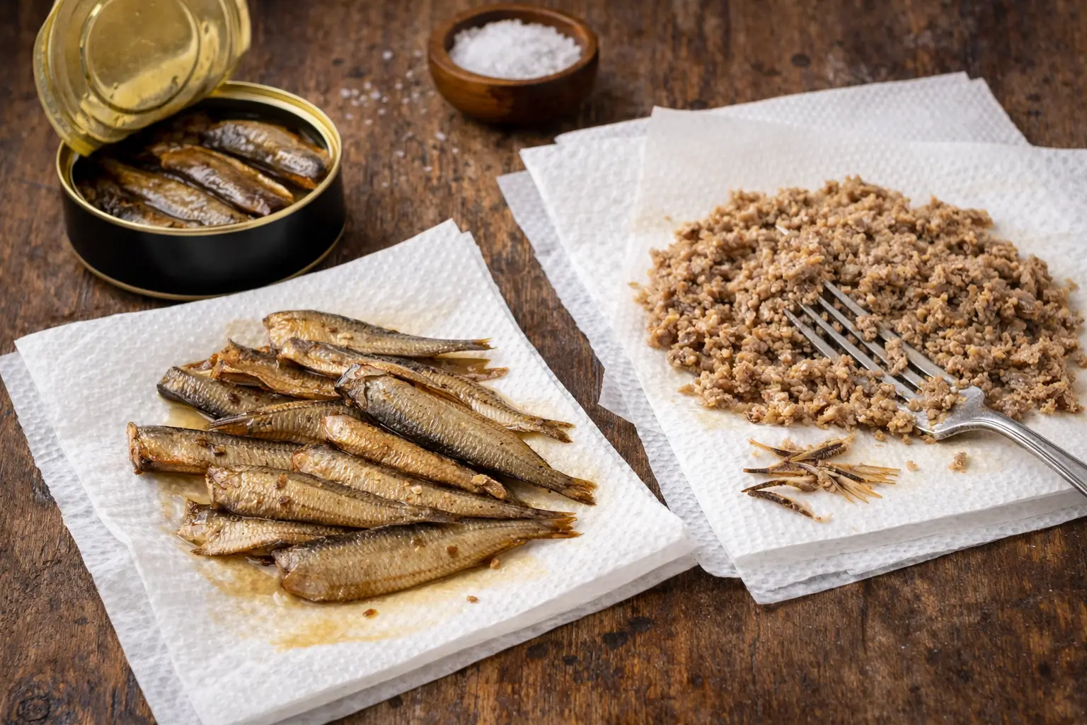 Откройте банку со шпротами, переложите рыбу на бумажное полотенце, сложенное в несколько слоев, и промокните, убрав лишнее масло. Шпроты разомните вилкой. При желании заранее удалите хвостики и крупные косточки — так текстура получится нежнее.