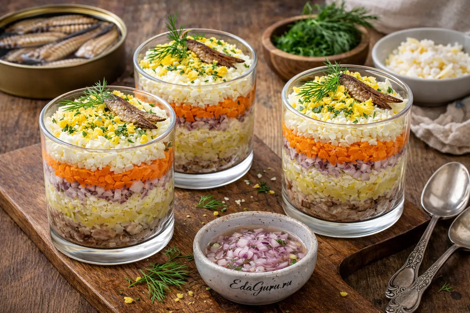 В этом варианте салат подают порционно. Возьмите большие стаканы или пиалы и выложите ингредиенты слоями: сначала размятые шпроты, затем маринованный лук, после него тертые белки, картофель и морковь. Чтобы порции выглядели аккуратно, слегка разравнивайте каждый слой, не утрамбовывая слишком плотно.