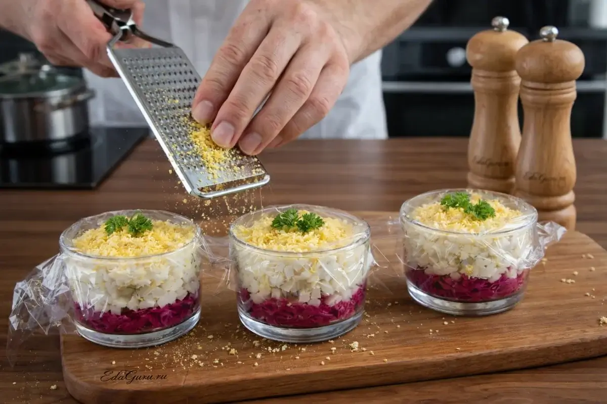 «Селедка под шубой» с яйцом — одна из самых узнаваемых закусок русской и советской кухни. Классическая основа салата — соленая сельдь, вареные овощи и майонез, уложенные слоями. Чаще всего используют картофель, морковь, свеклу и лук, а добавление вареного яйца делает вкус мягче и нежнее. Свекла придает блюду характерный цвет и сладковатый вкус, а сельдь создает яркий солоноватый контраст. Салат стал особенно популярным в советское время и прочно вошел в праздничное меню, особенно новогоднее. Несмотря на распространенную красивую легенду о происхождении блюда в дореволюционной трактирной среде, документально подтвержденных данных об этой версии нет. Зато точно известно, что «селедка под шубой» давно стала частью домашней кулинарной традиции и до сих пор остается одним из самых любимых слоеных салатов.