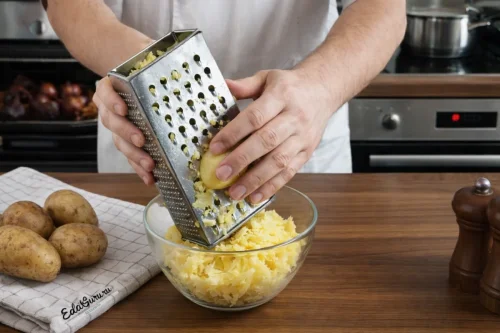 Отварите картофель в мундире до полной готовности. Затем его остудите, снимите кожуру и натрите на крупной терке в емкость. Чтобы картофель легче натирался и не слипался, дайте ему хорошо остыть.
