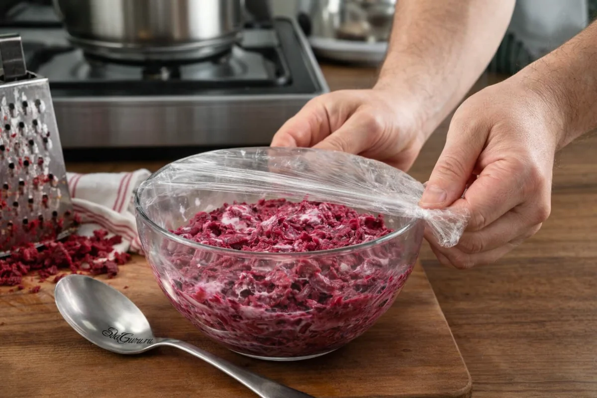 Дайте свекле полностью остыть, после чего снимите кожицу и крупно натрите ее в миску. Добавьте 2 ст. л. майонеза и хорошо перемешайте. Затем накройте миску пищевой пленкой и поставьте в холодильник до момента использования. Если свекла еще теплая, майонез может расслоиться, поэтому лучше не спешить.