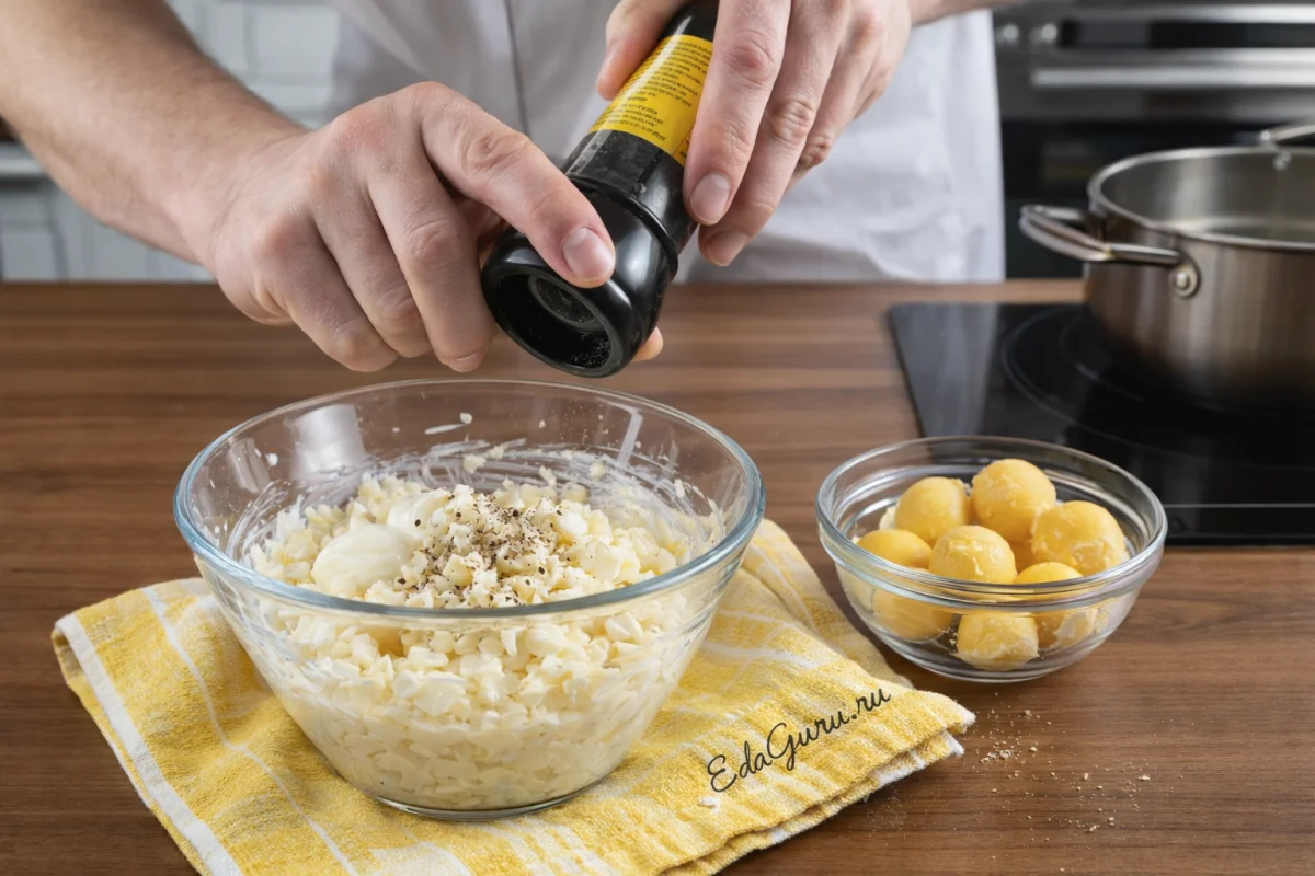 Сваренные вкрутую и уже остывшие яйца очистите от скорлупы, затем отделите желтки от белков. Белки измельчите, соедините с картофелем и заправьте двумя ст. л. майонеза, посолите и поперчите. Желтки пока отложите — они понадобятся позже.