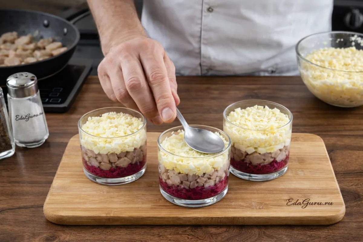 Сначала выкладываем свеклу, затем сельдь, после нее лук и сверху картофельную массу с белками. Каждый слой слегка уплотняйте обратной стороной столовой ложки, но не слишком сильно, чтобы салат оставался нежным.