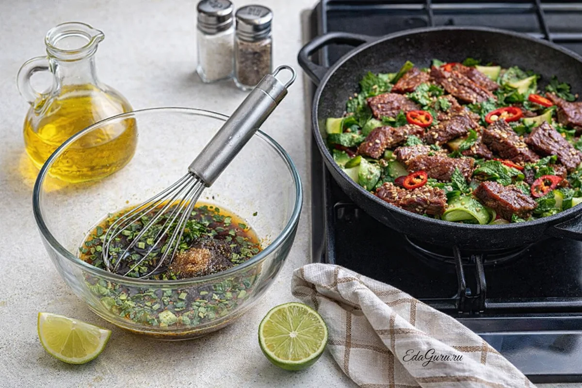 Острый салат с говядиной