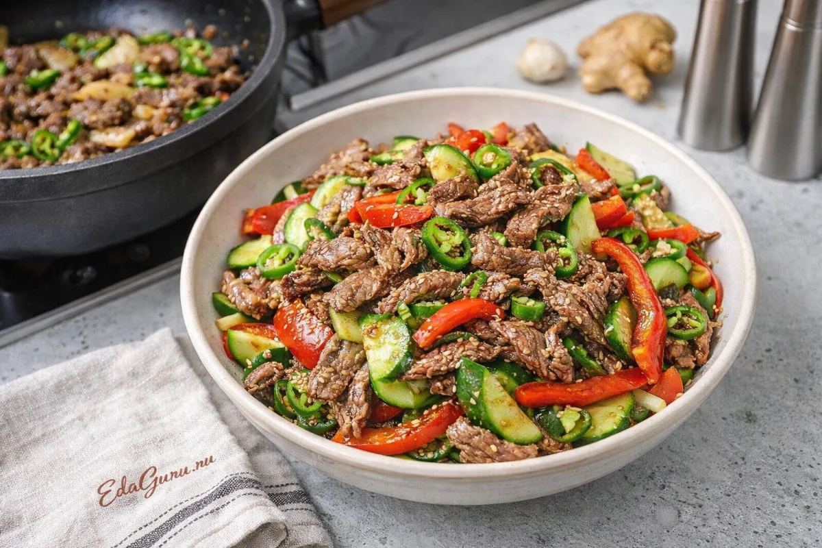 В широкой сковороде нагрейте масло. Сначала обжарьте чеснок, острый перец и имбирь примерно 25 секунд. Затем добавьте говядину и готовьте еще 4 минуты. Переложите все в емкость, после чего доложите сладкий перец и огурец и аккуратно перемешайте.
