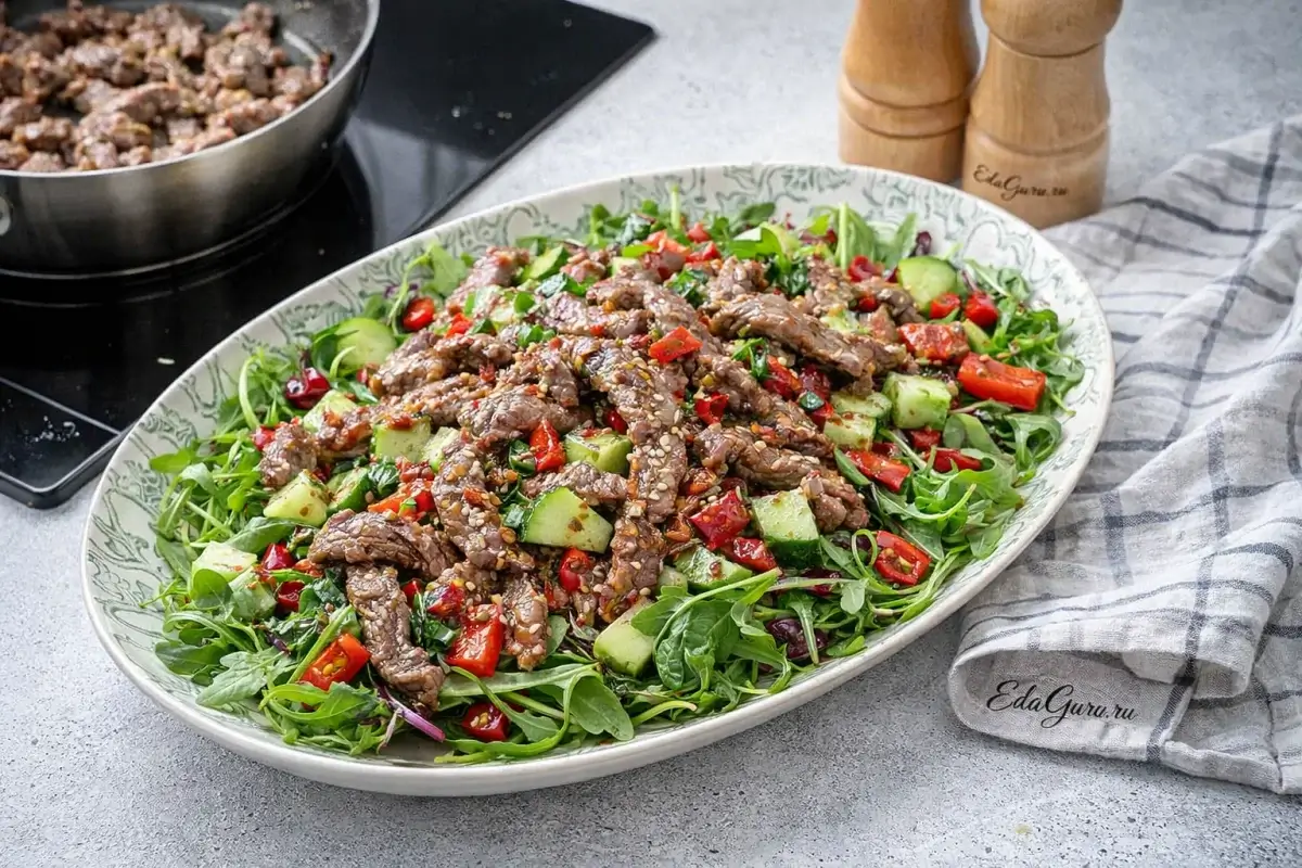 Острый салат с говядиной — сытная закуска, в которой сочетаются отварная или жареная говядина, свежие овощи, зелень и пикантная заправка. Такие салаты особенно популярны в азиатской кухне: например, в китайской и корейской традиции мясо часто подают с острыми соусами, чесноком, перцем и овощами. Говядина хорошо подходит для салатов благодаря плотной текстуре и высокому содержанию белка, железа и витаминов группы B. Остроту обычно регулируют с помощью перца чили или соусов на основе перца. Можно добавить кислые и сладкие ноты — такие, как соевый соус, сахар или сок лайма. Перед подачей салату дают немного настояться, чтобы мясо и овощи лучше впитали заправку.