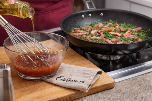 В небольшой емкости соедините красное вино и два вида уксуса, посолите и поперчите. Добавьте две ст. л. оливкового масла. В сковороду выложите бекон, тонко нарезанный и обжаривайте на среднем огне 6 минут, пока он не станет полупрозрачным. После этого добавьте зелень. Следите, чтобы бекон не пересушился: он должен остаться мягким, а не хрустящим.