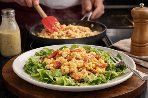 Взбейте яйца, слегка поперчите и посолите. Перелейте яичную смесь в сковороду с беконом, она должна быть не слишком горячей. Готовьте на слабом огне, все время помешивая, пока не появятся крупные мягкие комочки. Если яйца начинают подсыхать, снимите сковороду с огня и продолжайте мешать — так текстура останется нежной. На блюдо выложите листья зеленого салата и полейте их заправкой. Затем добавьте яичную массу и перемешайте. Сразу подавайте на подогретых тарелках.