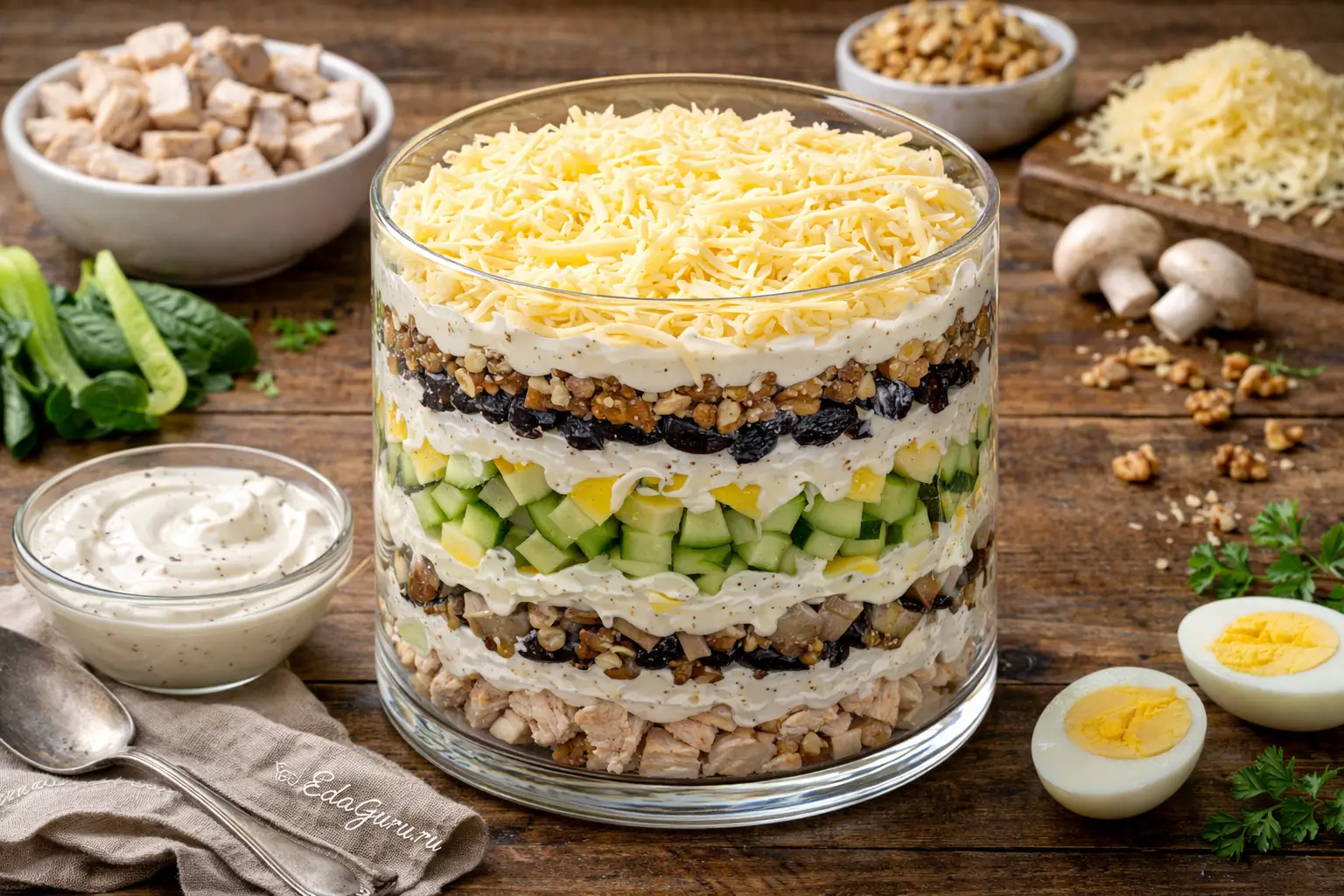 Смешайте майонез со сметаной для заправки , затем добавьте соль и перец по вкусу и хорошо размешайте. После этого выкладывайте компоненты слоями, слегка уплотняя каждый и промазывая его соусом. Соблюдайте порядок слоев: сначала обязательно филе, огурцы, яйца, грибы, чернослив, грецкие орехи, последний ингредиент это сыр. Не прижимайте слои слишком сильно, чтобы салат остался нежным.
