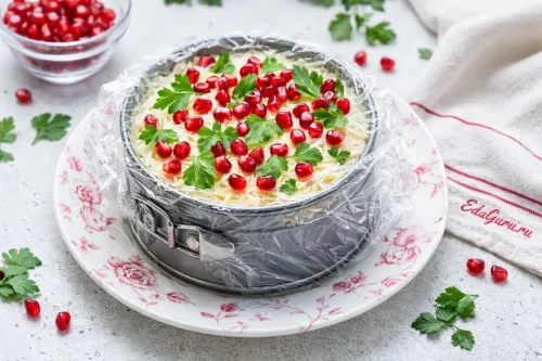 Соусом верхний слой смазывать не надо. Накройте пищевой пленкой и поставьте в холодильник как минимум на два часа, чтобы он хорошо пропитался. Перед подачей украсьте петрушки и зернами граната.