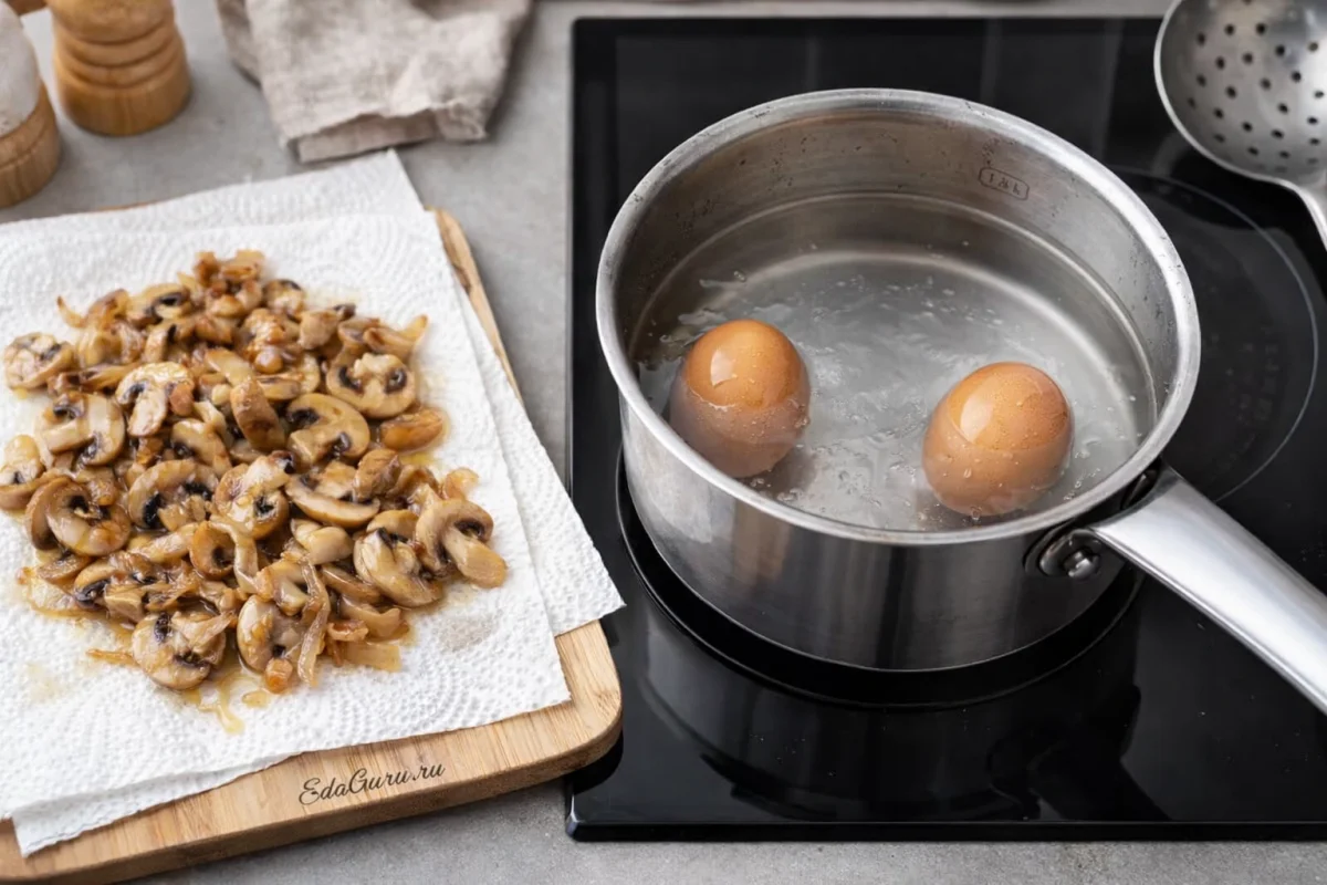 Яйца отварите вкрутую: после закипания им достаточно 8 минут. Затем остудите их — так они будут легче очищаться.