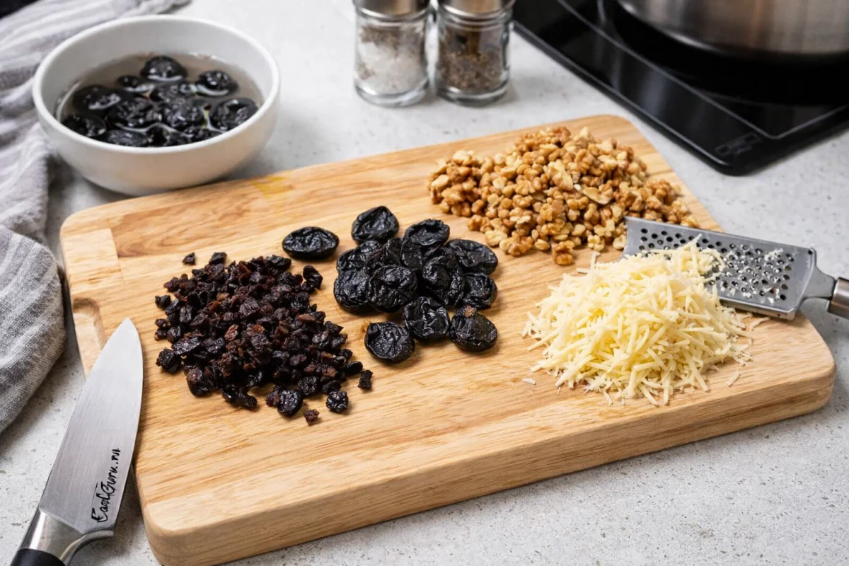 Чернослив хорошо промойте под теплой проточной водой, после чего залейте теплой кипяченой водой примерно на 15 минут. Затем дайте немного обсохнуть и нарежьте. Натрите на терке твердый сыр. Грецкие орехи измельчите.
