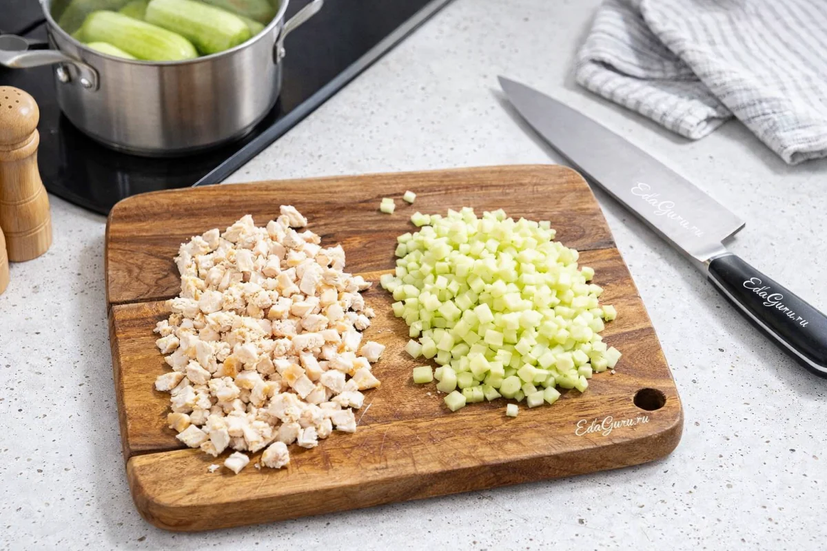 Охлажденное куриное мясо порежьте небольшими кусочками. Огурцы очистите от кожуры, также нарежьте мелкими ломтиками. Старайтесь делать кусочки примерно одинакового размера.