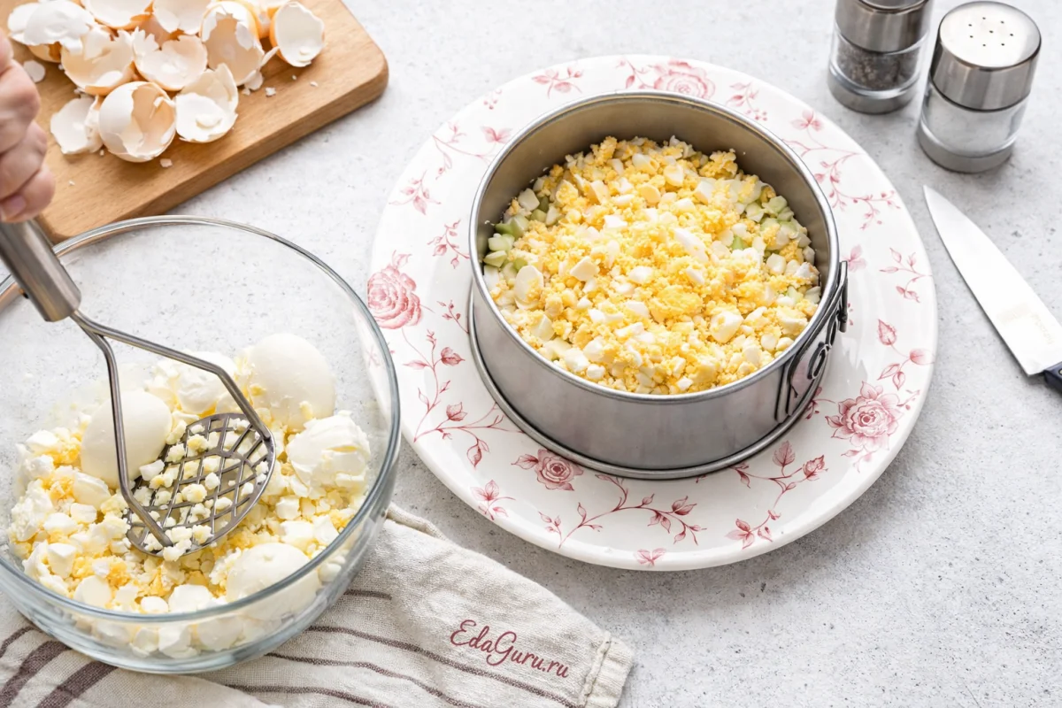 Яйца очистите и разомните до однородной массы. Поставьте на плоскую тарелку кулинарное кольцо диаметром 15 см.