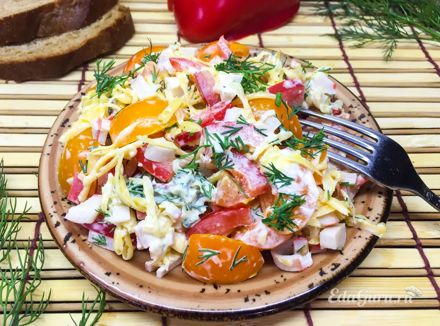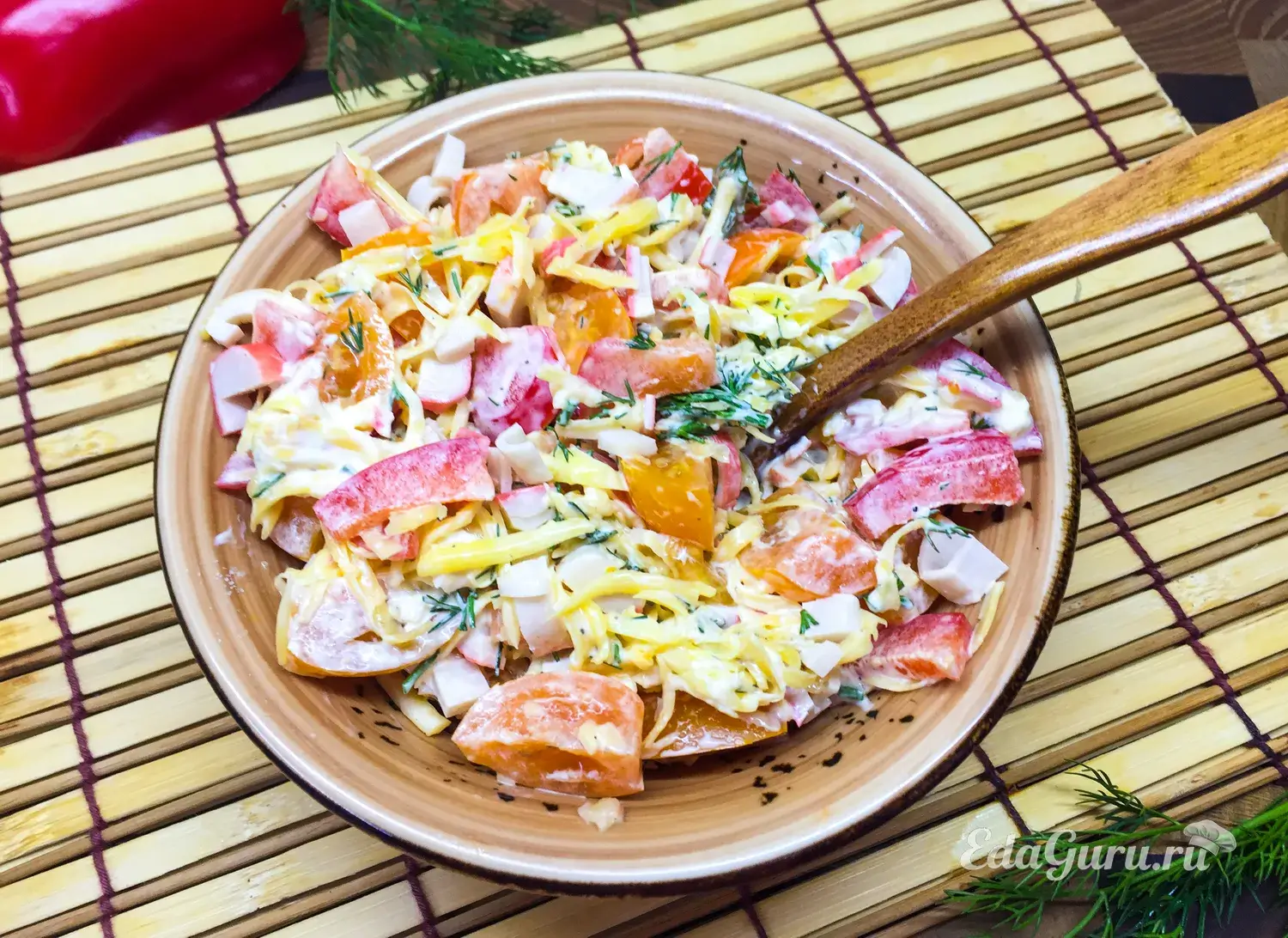 Готовый крабовый салат с черри, сладким перцем и сыром выкладываем на сервировочное блюдо, сверху посыпаем зеленью. Подаем на стол как отдельную закуску.
