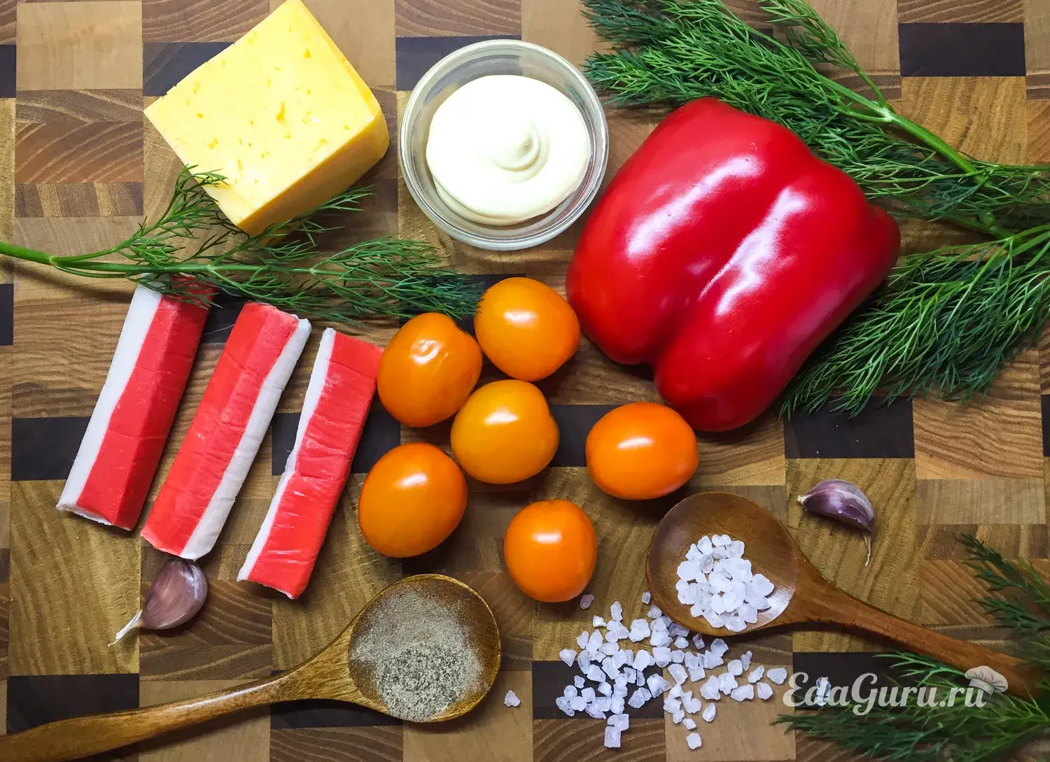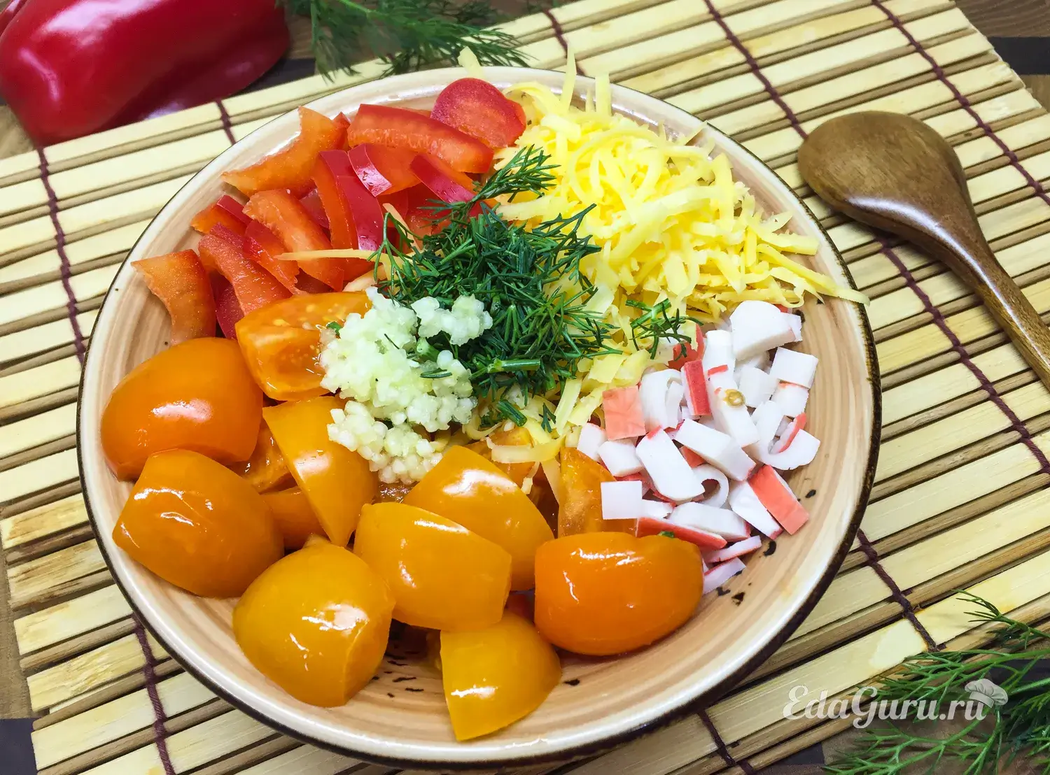 В подходящую посуду выкладываем готовую нарезку: крабовые палочки, черри, сладкий перец, зелень, чеснок и сыр.