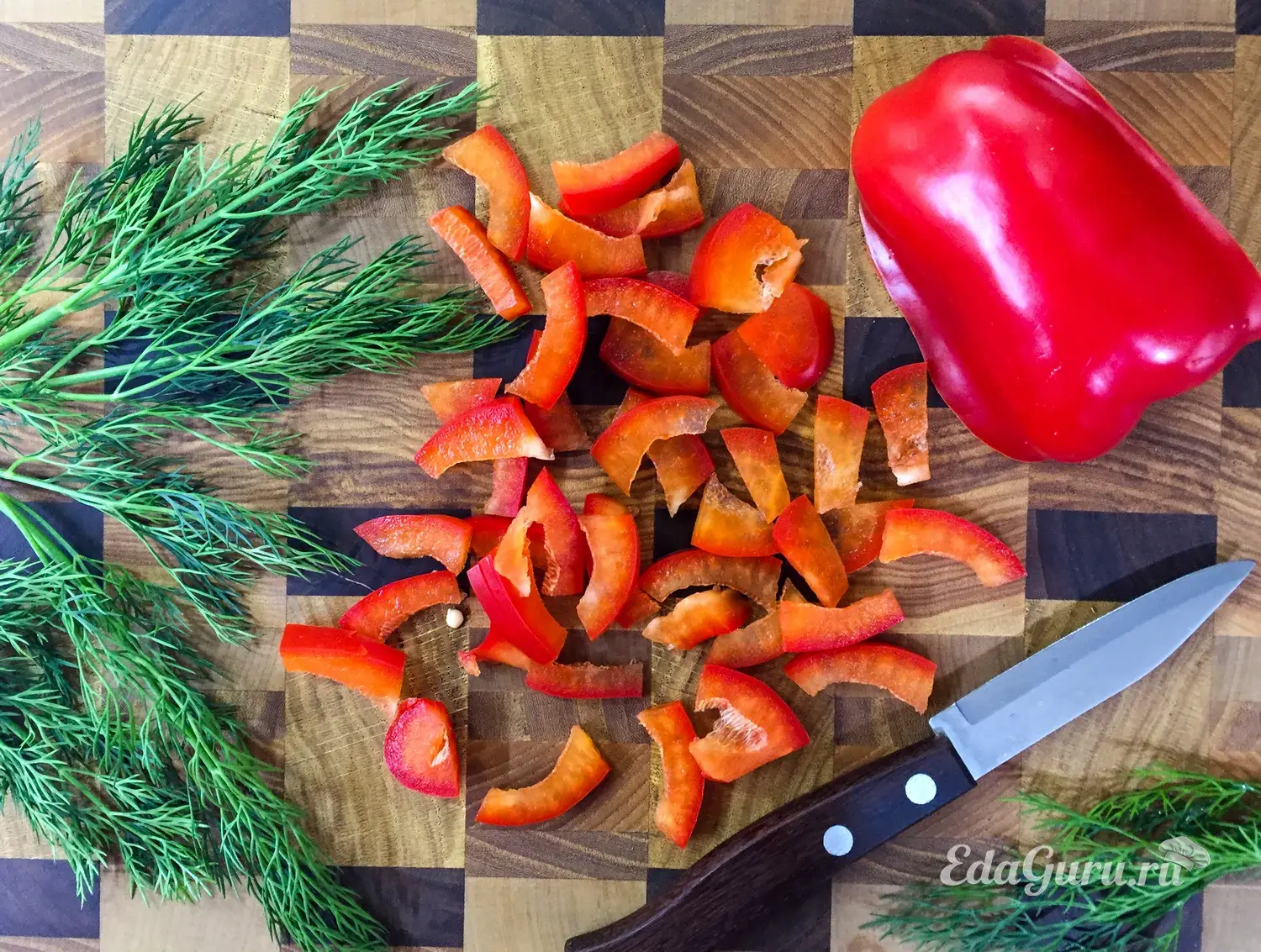 Сначала подготовим всю необходимую нарезку: болгарский перец споласкиваем, подсушиваем полотенцем, удаляем семена и внутренние перегородки. Нарезаем его небольшими кусочками.