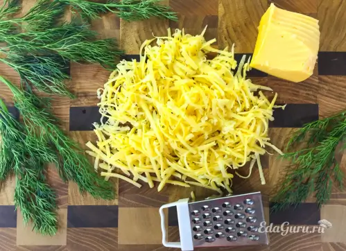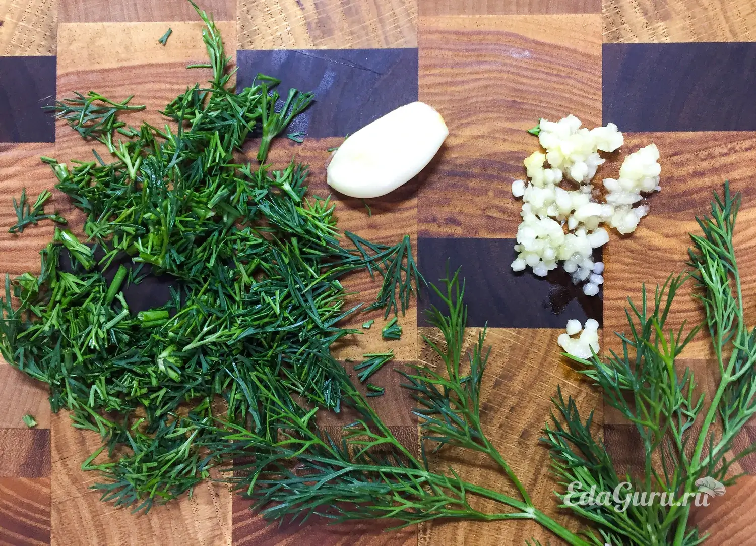 Промытую и подсушенную зелень укропа крошим мелкими листочками. Чеснок чистим от шелухи и измельчаем с помощью ножа или любым другим способом.