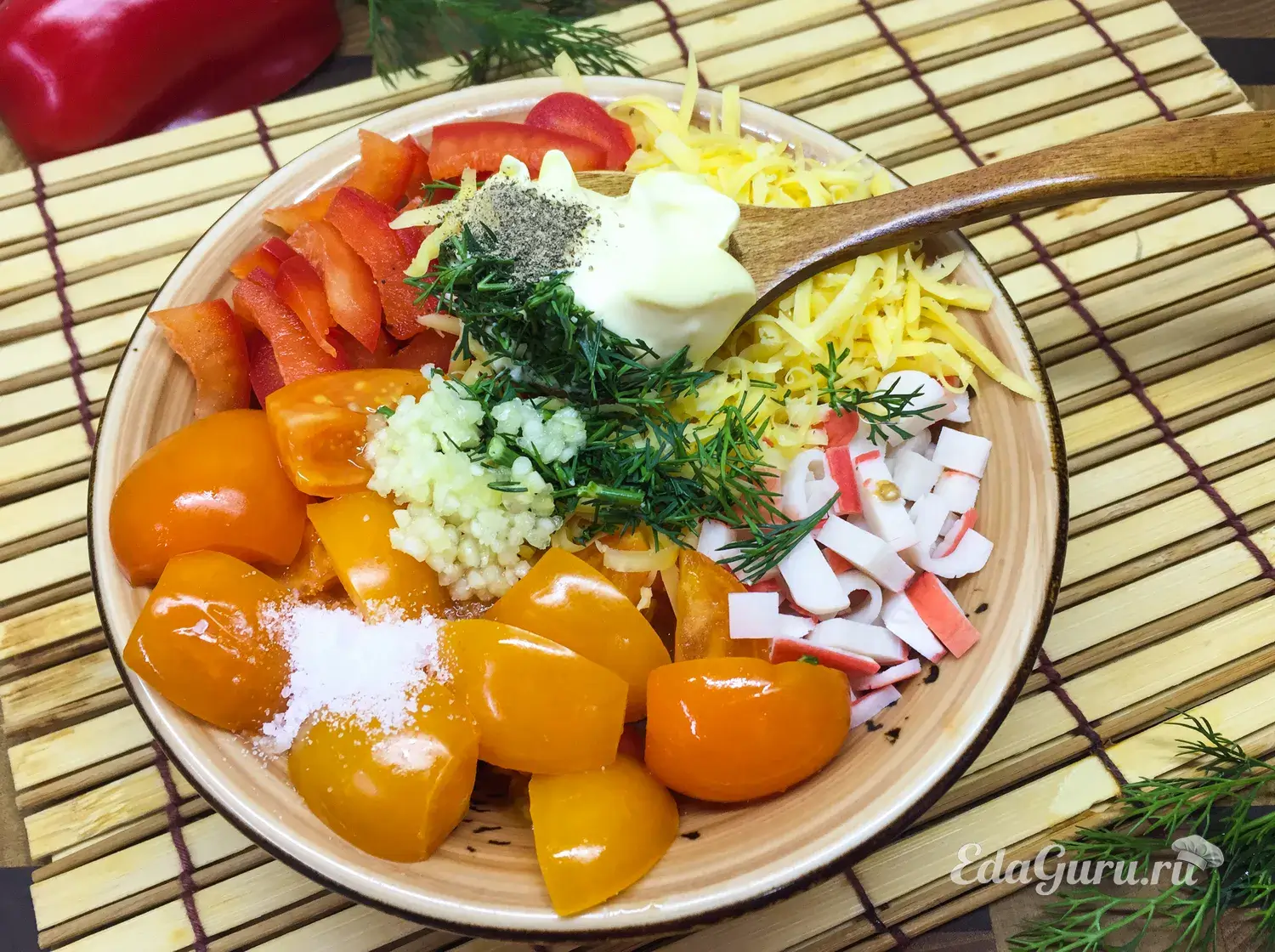 По вкусу перчим, солим и заправляем майонезом.