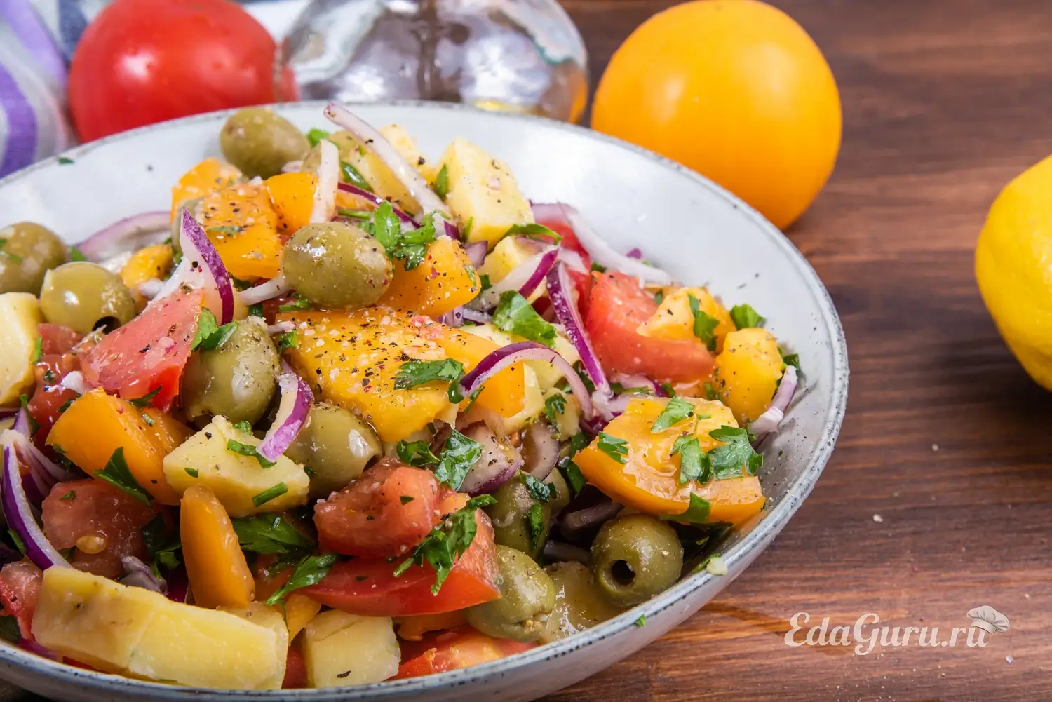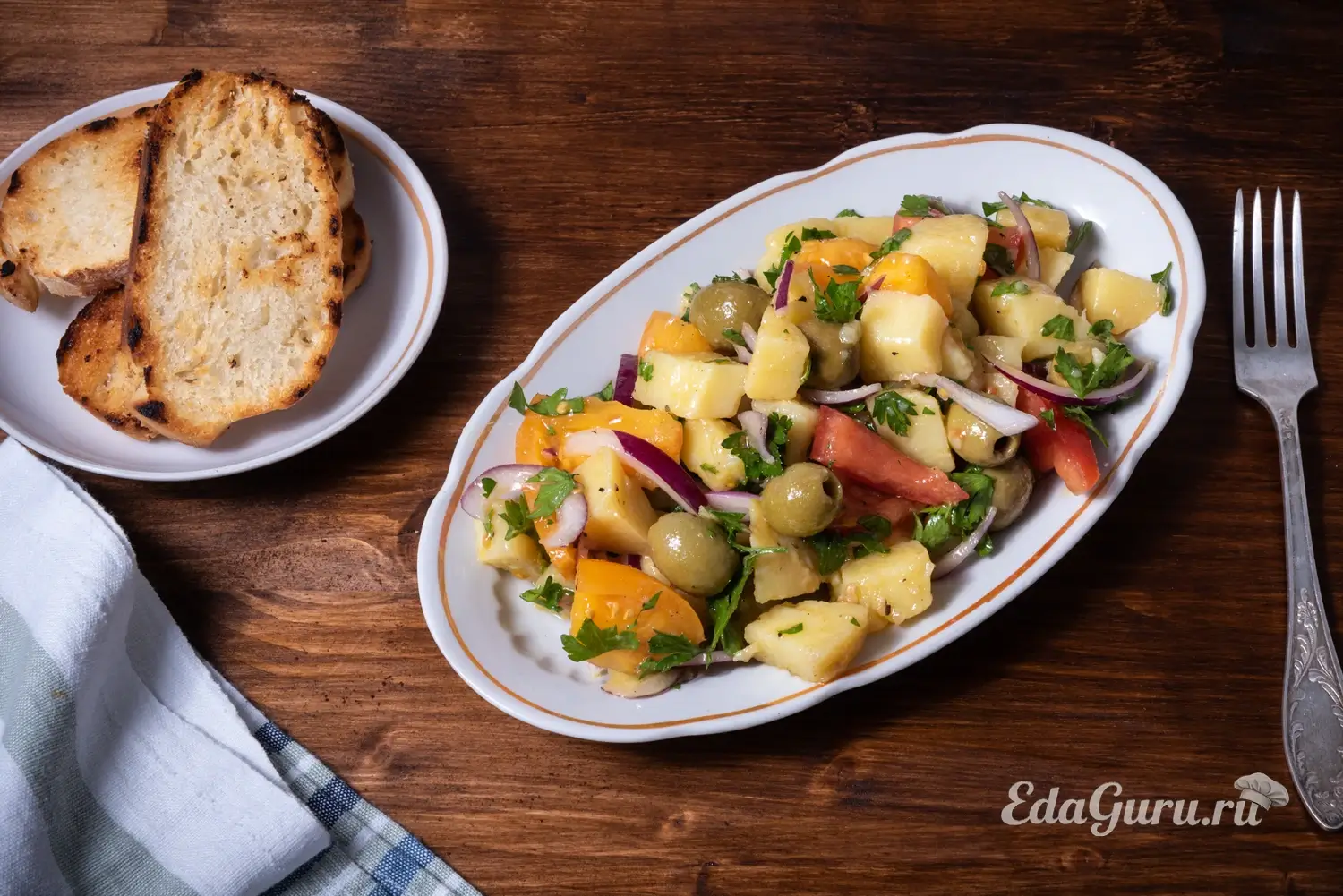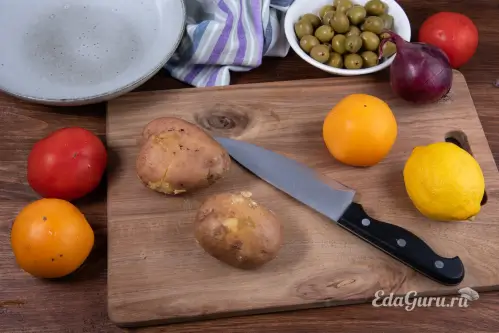 Картофель отвариваем в мундире. Воду для картофеля надо немного посолить, чтобы картофель получил немного соли. Так вы выровняете вкус всех ингредиентов салата. Вареный картофель чистим и режем средними кубиками. Томаты режем средними кусками, а лук перьями. Оливки можно не резать.