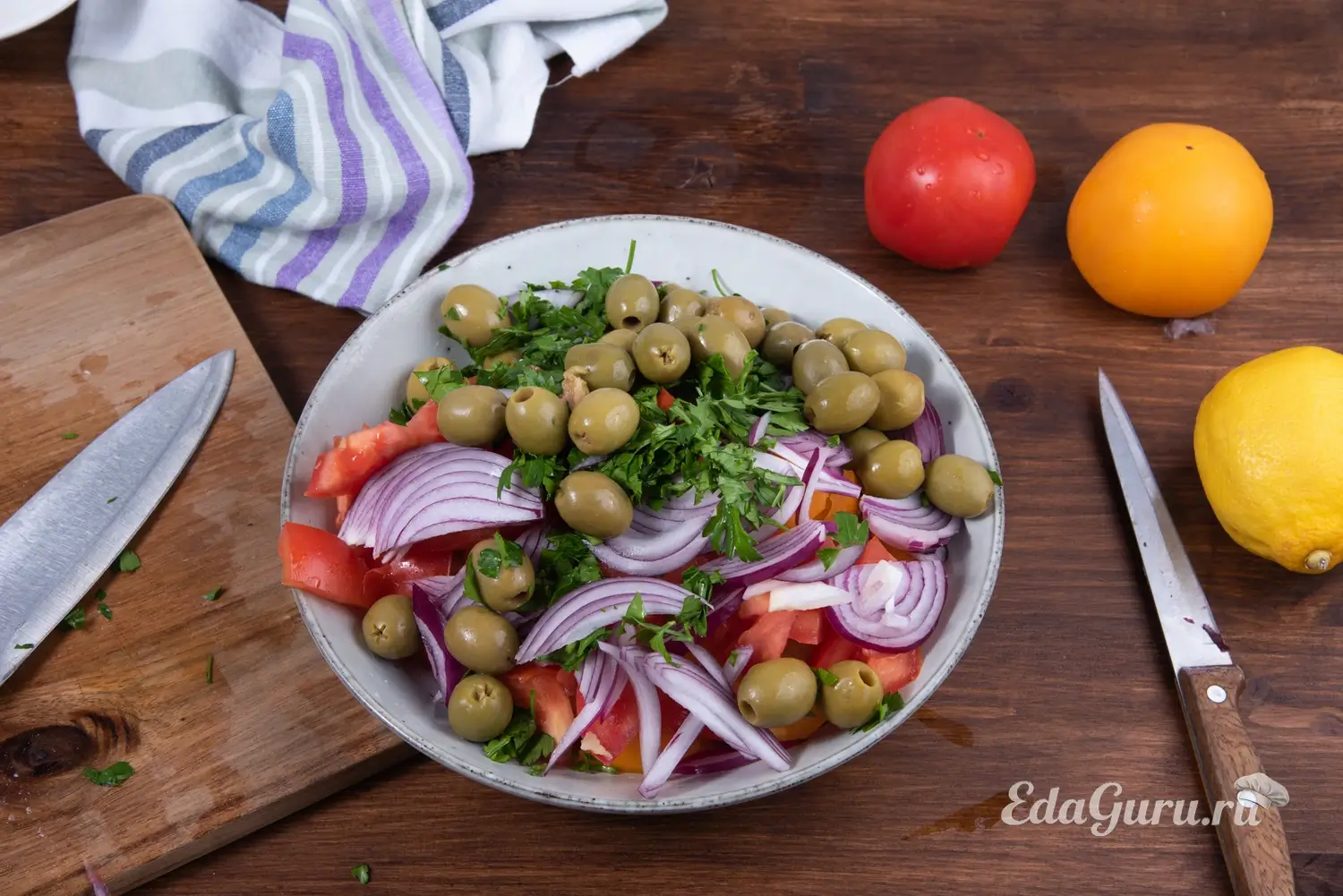 Все отправляем в миску и начинаем готовить салатную заправку. Заправка у нас простая и очень распространенная в итальянской кухне. Масло смешиваем с соком четверти лимона, черным молотым перцем и ставим на 1 час в холодильник. Салат заправляем за 5-10 минут до подачи. Выливаем в нашу миску с овощами заправку, солим, перемешиваем и даем постоять.