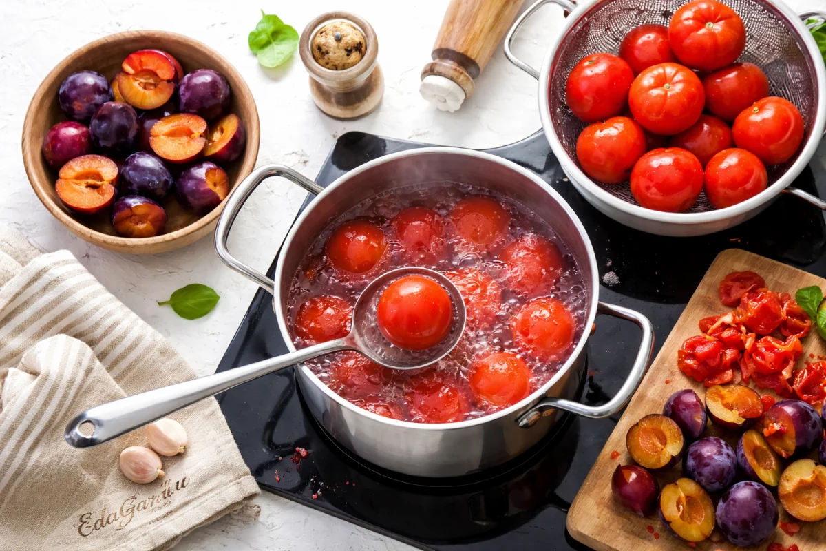 Тщательно промойте помидоры и сливы. Поочередно ненадолго, примерно на минуту, погрузите их в кипящую воду. После этого откиньте плоды на дуршлаг, слегка остудите и снимите кожицу. Из слив дополнительно удалите косточки.