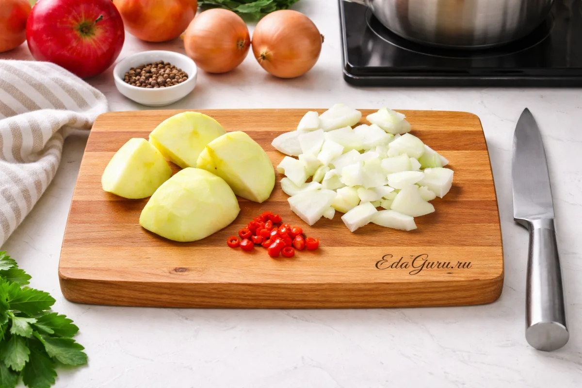 Яблоки для кетчупа тщательно вымойте, разделите на четыре части, вырежьте сердцевину вместе с семенами и снимите кожуру с мякоти. Лук освободите от шелухи и мелко нарубите. У перца чили уберите семена, а оставшуюся мякоть мелко порежьте.