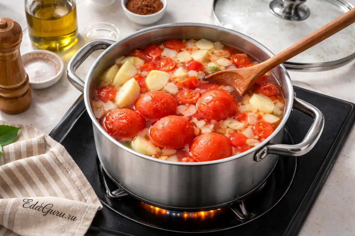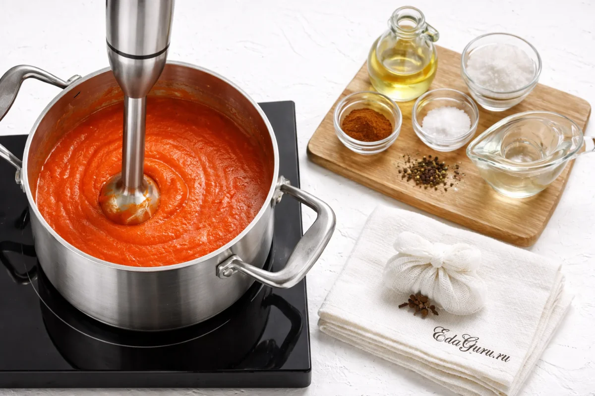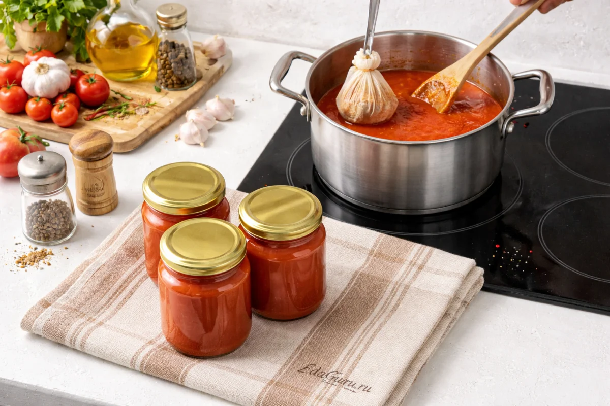 Для более густого и насыщенного кетчупа выбирайте мясистые помидоры и плотные кисло-сладкие яблоки, а после измельчения при желании протрите массу через сито — текстура получится заметно более гладкой, как у магазинного соуса. Специи в марле действительно удобнее добавлять целыми: так вкус будет чище, без жестких вкраплений, и кетчуп не потемнеет от переэкстракции. Яблоки можно заменить дополнительным количеством слив, если нужен более яркий фруктовый оттенок и мягкая кислинка, но тогда соус обычно выходит чуть менее плотным.