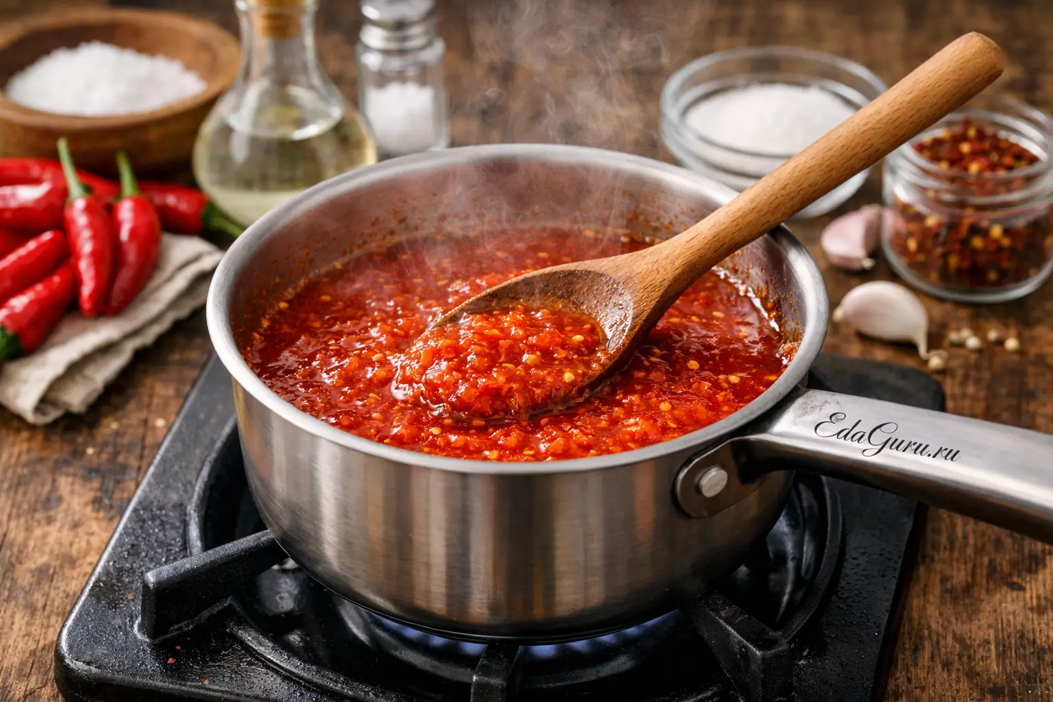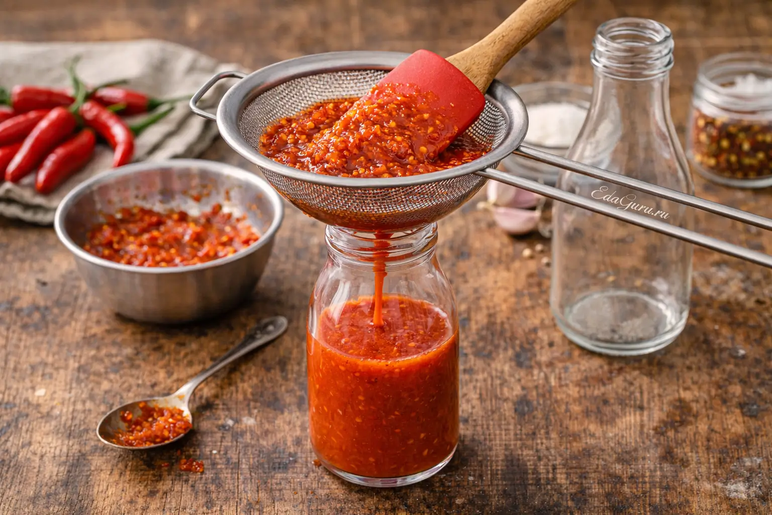 Снимите соус с плиты, полностью остудите, затем при желании протрите через сито для более гладкой текстуры. Перелейте в чистую бутылочку или банку и уберите в холодильник. После короткого настаивания вкус станет ярче и глубже.