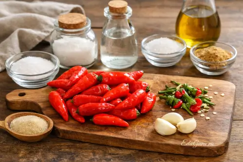 Острый красный перец хорошо вымойте, обсушите и удалите плодоножки. Если хотите получить особенно жгучий соус, семена можно оставить. Чеснок очистите, а остальные ингредиенты заранее отмерьте, чтобы всё было под рукой.