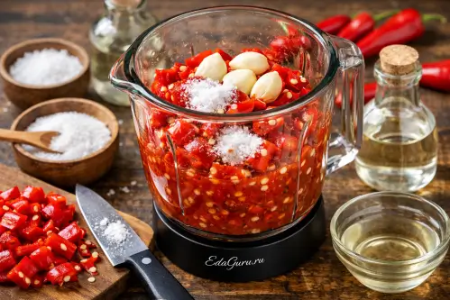 Острый красный перец хорошо вымойте, обсушите и удалите плодоножки. Если хотите получить особенно жгучий соус, семена можно оставить. Чеснок очистите, а остальные ингредиенты заранее отмерьте, чтобы всё было под рукой. Добавьте соль, сахар и уксус.