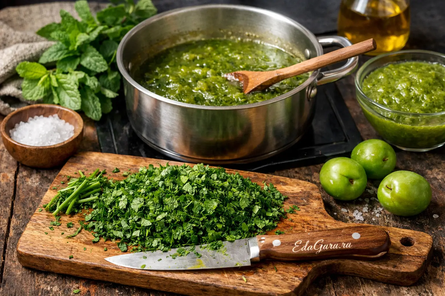 Свежую мяту и остальную зелень промойте, затем хорошо обсушите и мелко порубите, оставляя в стороне жесткие стебли. Переложите зелень в пюре из слив, после чего верните кастрюлю на слабый нагрев и дождитесь закипания соуса.